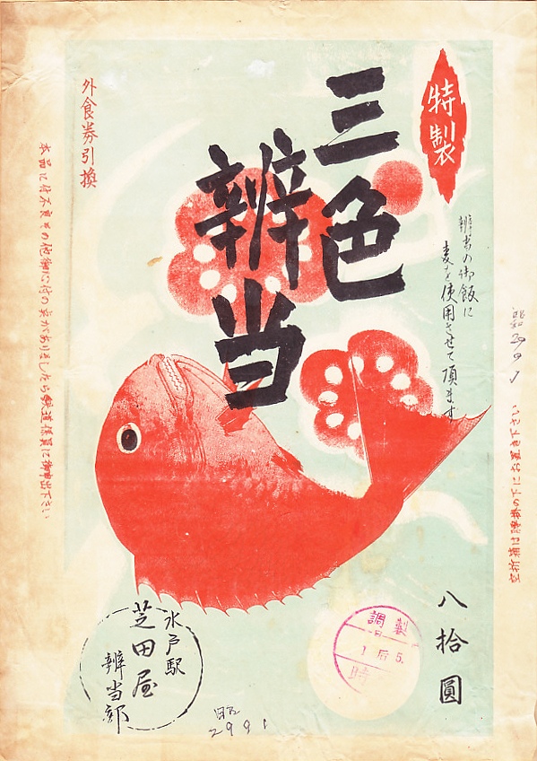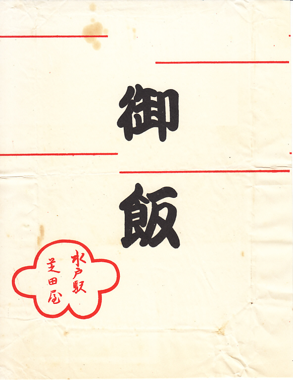 1950年代、昭和30年前後のものと思われる、昔の水戸駅弁の掛紙。収集者は1954(昭和29)年9月1日の調製とみなし、掛紙にいくつも記した。この当時の駅弁によくある「外食券引換」の文字に加えて、「辨當の御飯に麦を使用させて頂ます」の注意書きがある。昭和時代の末期には健康食や美食になり、あるいは仙台の牛タンに合わせた麦飯は、この頃には白米でなく申し訳ないと調製元が詫びる存在であったことがうかがえる。
