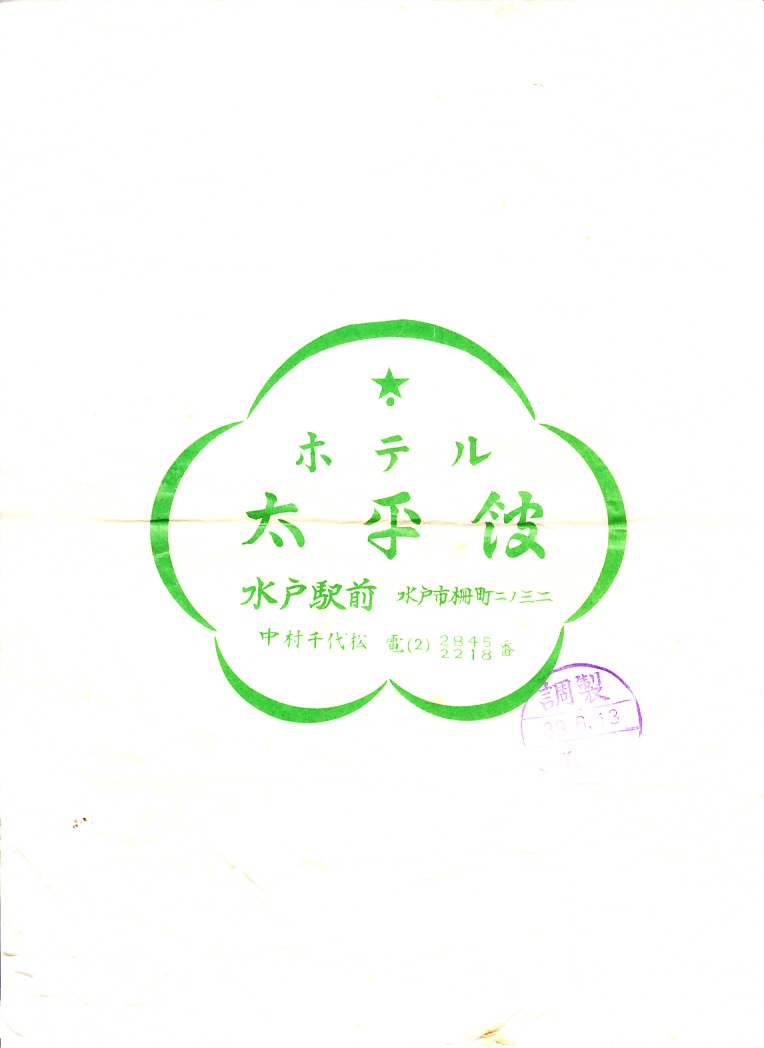 1964(昭和39)年6月13日の調製をうかがわせる紙片。調製元が水戸駅の駅弁屋ということで、駅弁の掛紙として収集されたが、さすがにそうではないだろう。料理弁当の掛紙代わりなのか、なぜホテルのナプキンに調製印を押したのか気になる。