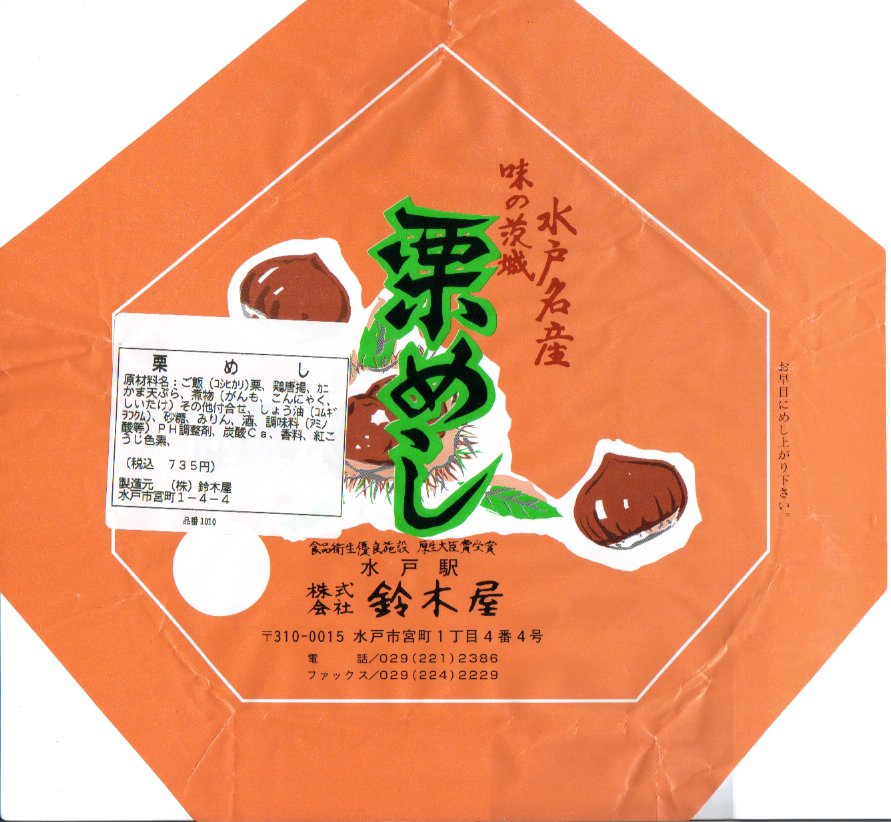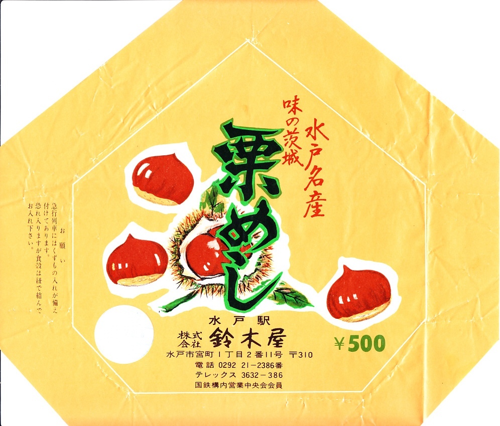 1976(昭和51)年3月20日の調製と思われる、昔の水戸駅弁の掛紙。栗型で栗色で栗の絵柄という、掛紙だけでクリの駅弁であることがわかる。