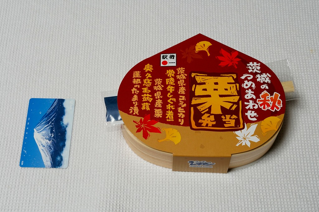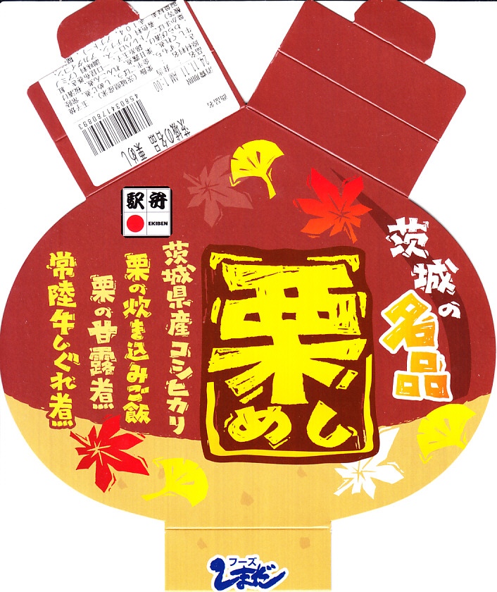 秋冬の駅弁大会シーズンに向けた、2023(令和5)年秋の新商品で、スーパーの駅弁大会で販売か。2024年10月からは水戸駅や東京駅で販売し、JR東日本の駅弁キャンペーン「駅弁味の陣2024」にエントリー。その姿は2018年の「茨城の秋つめあわせ栗弁当」にそっくり。中身は異なるようで、栗型の容器をぴったり覆うスリーブの文字に反映されている。