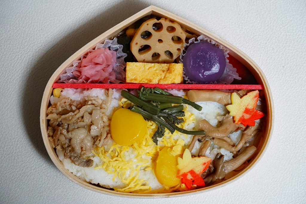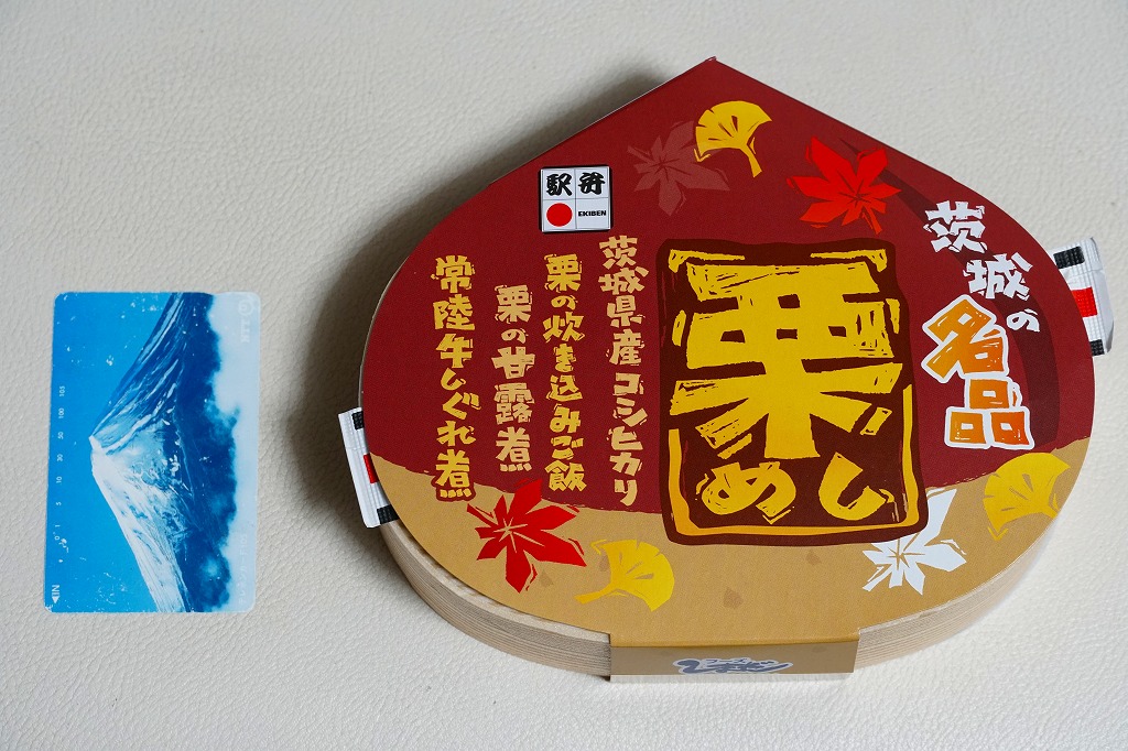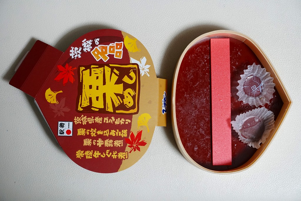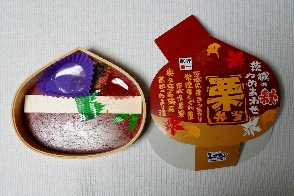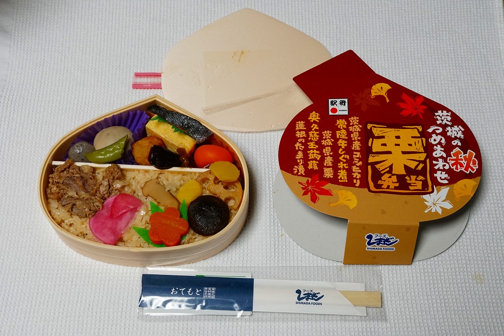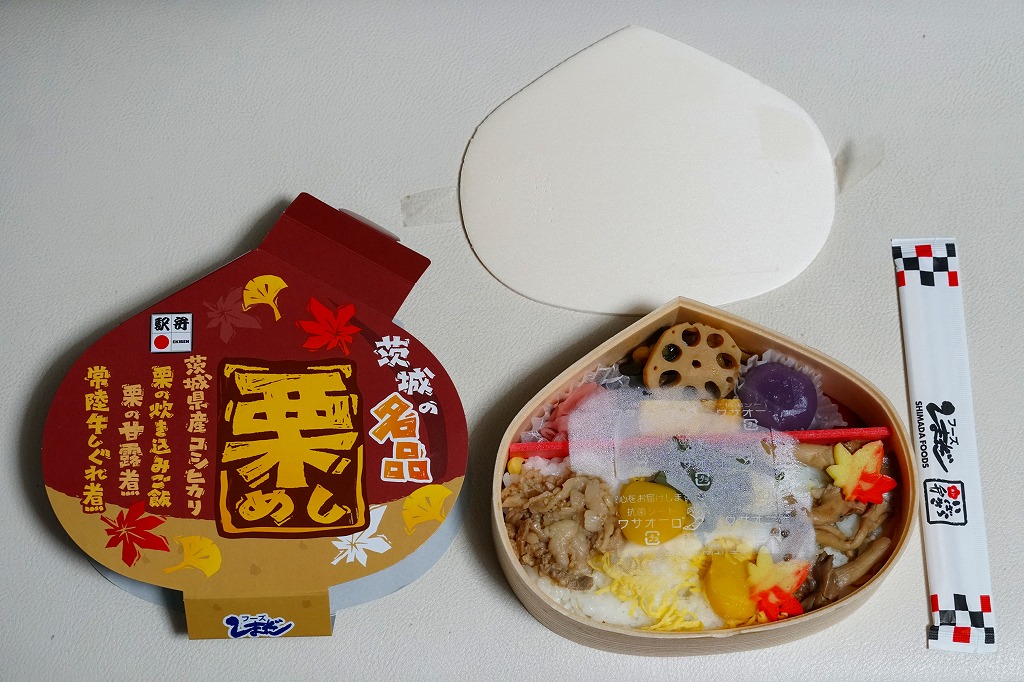 この容器に栗の炊き込みご飯を詰め、栗の甘露煮を載せ、常陸牛しぐれ煮とわらび漬けとしめじ煮と、紅葉型のかまぼこと錦糸卵も載せ、玉子焼、きんぴらごぼう、れんこん煮、一口昆布巻き、大根桜漬、くずもちを添える。形状も文字も栗だけど、御飯は真っ白なおこわに感じ、目に見える2個以外にクリはどこへあったのか。キャンペーンの紹介文に「茨城の秋の味をつめあわせた栗型のお弁当」とあったので、これは栗飯でなく栗の形のお弁当なのだろう。