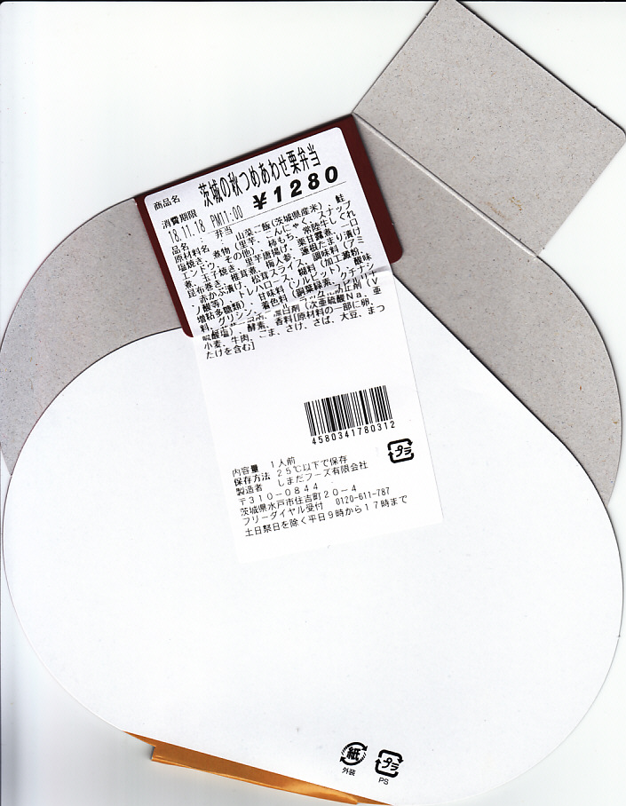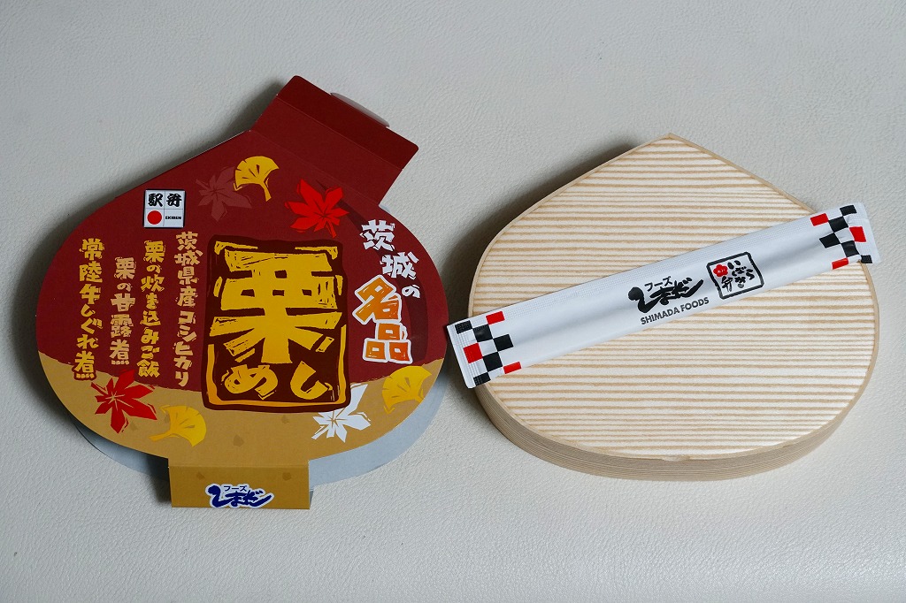 水戸駅の古風な栗飯駅弁。栗型容器は総経木製で、それを昭和レトロなデザインの掛紙で包み栗色の紙ひもでしばる。中身は椎茸と甘い栗が載った栗飯に、鶏唐揚やカニカマ天などを添える。かつて栗飯駅弁はその存在だけで有名になったようなのに、水戸の栗飯は無名で、つまり味はそんなもの。但しここまで古風に残ってくれているのなら、せめて食品表示のシールを掛紙でなく容器側面にでも貼り付けて、あと一歩の外観の演出が欲しかった。
