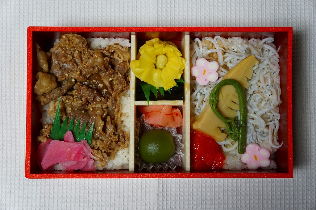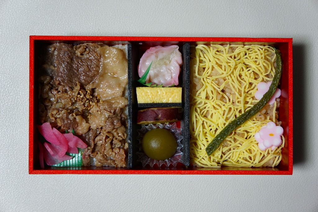 中身は既存の水戸駅弁「牛べん」と「釜揚げしらす弁当」の組合せ。細長い容器の左側で白飯を牛肉煮で覆い大根桜漬を添え、右側で白飯をしらすで覆いワラビとタケノコと明太子と梅かまぼこを添え、青梅甘露煮、梅れんこん、昆布巻、黄華花咲き蒸しをその間に配置する。既存のおいしい駅弁の組合せなので、これもまた美味。