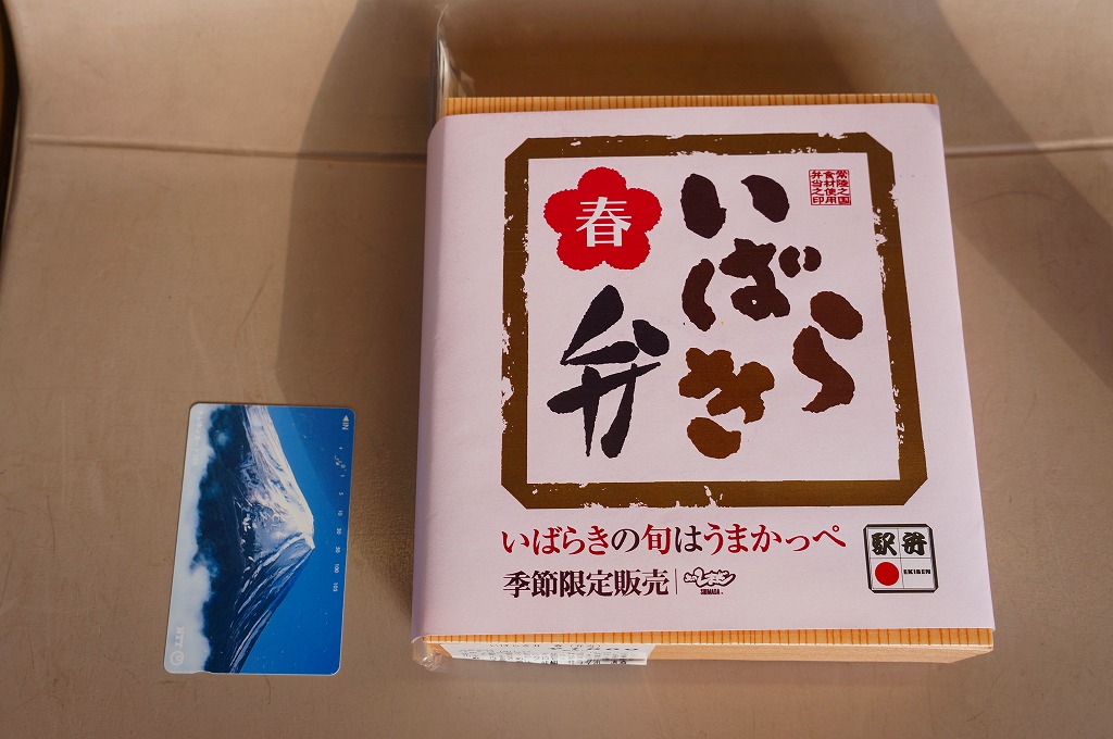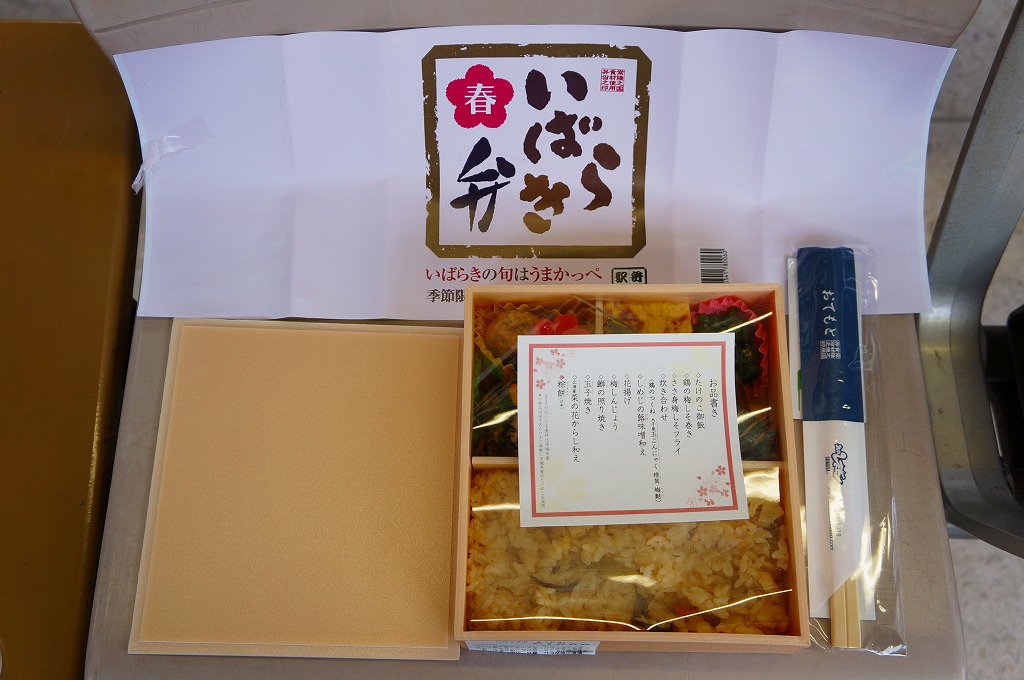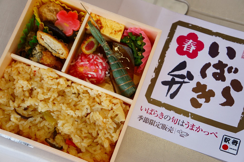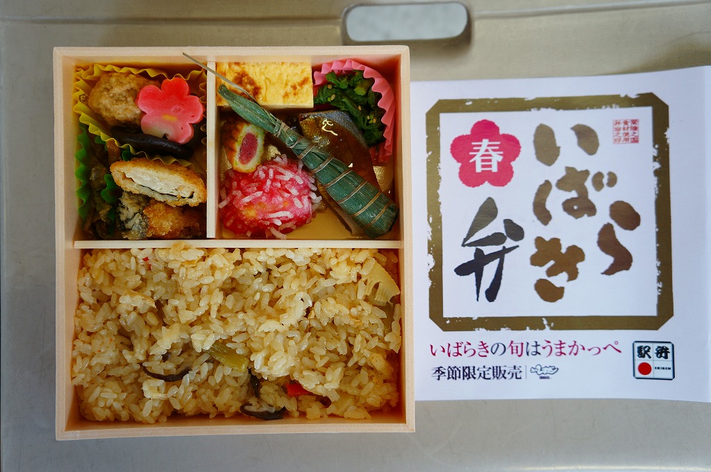 2013(平成25)年4月1日から6月初旬まで販売された新作駅弁で、前年の9月22日から12月2日まで販売された「いばらき弁 秋」の春バージョン。中身はタケノコ御飯に鶏梅しそ巻、鶏ささみの梅しそフライ、鶏つくねやシイタケなどの炊合せ、シメジ蕗味噌和え、花揚げ、梅しんじょう、ブリ照焼、玉子焼、菜の花、ちまき餅。梅と県産のタケノコで多くを固める茨城の味であり、確かな春のお弁当。10月には「秋」も出たが、この年のみ、または2014年までの販売か。