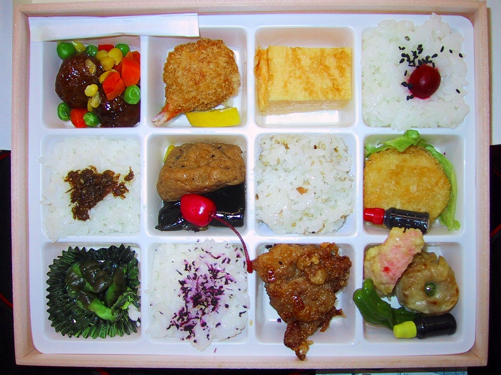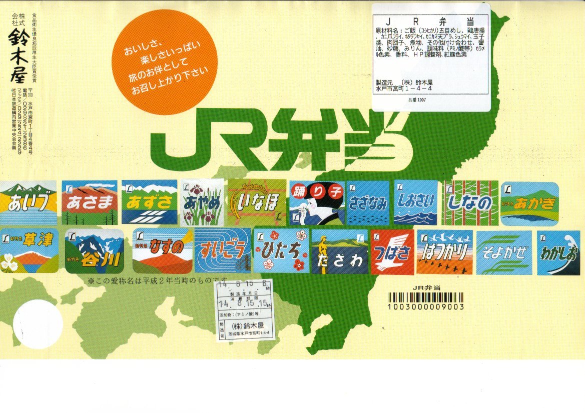 1987(昭和62)年に、JRグループ発足を記念して発売。長方形の容器を内部で12分割し、4種の御飯やフライなど雑多な具がちらばる。水戸でなぜJR弁当?と思うが、当時の水戸駅は駅弁業者が3社も入る日本有数の駅弁激戦地だったので、生き残りを賭けてアイデアを何でも取り入れていたのだろう。この駅弁は15年目にも生き残っている。食事よりも酒のつまみ向け、平たく浅い容器は揺れる特急「スーパーひたち」にも向いている。