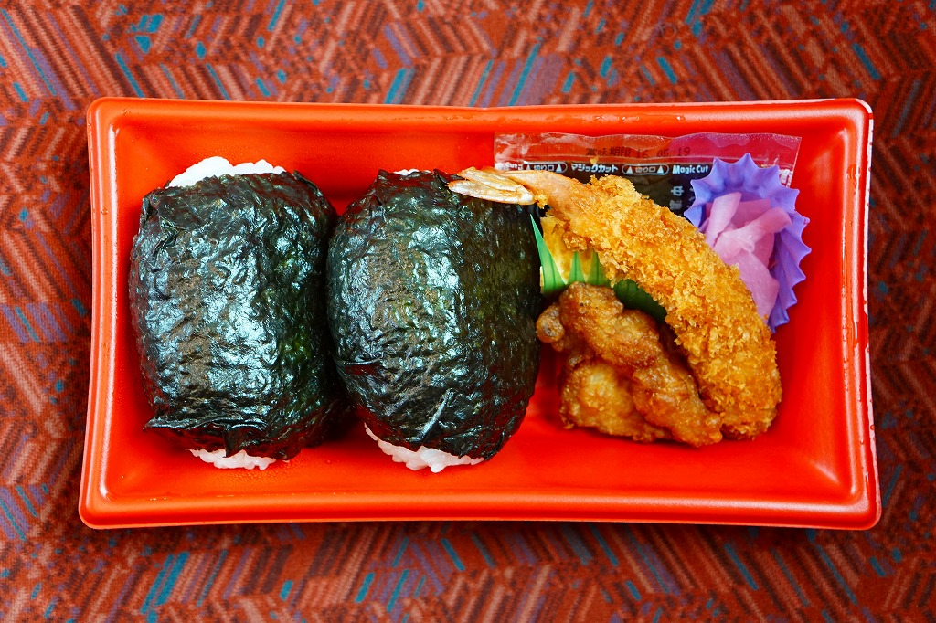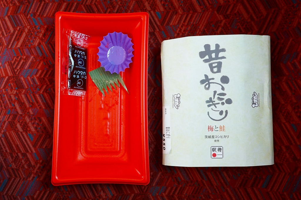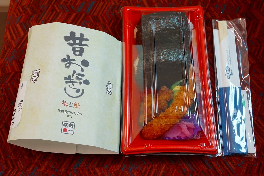 容器も価格もコンビニ商品風で、これが売られる店もエキナカのコンビニであるが、おにぎりにおかずを添えるセット販売は、古風な昔のスタイルかもしれない。食べればスーパーやコンビニとは違う印象の、しっかりしたおにぎり駅弁。価格は2012年時点で500円、2014年時点で550円。2018年までの販売か。
