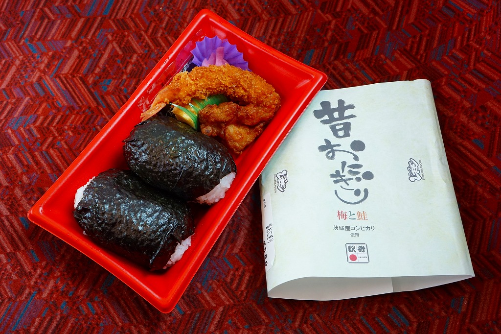 2011(平成23)年4月までに、水戸駅で発売か。この時に登場した4種の駅弁「常陸之國(ひたちのくに)美味紀行」(1,000円)「牛べん」(1,000円)「豚べん」(950円)「昔おにぎり」(500円)の一角。掛紙の文字で分かるとおり、茨城産コシヒカリを使う梅おにぎりと鮭おにぎりがひとつずつ入り、エビフライ、鶏唐揚、玉子焼、大根桜漬を添える。
