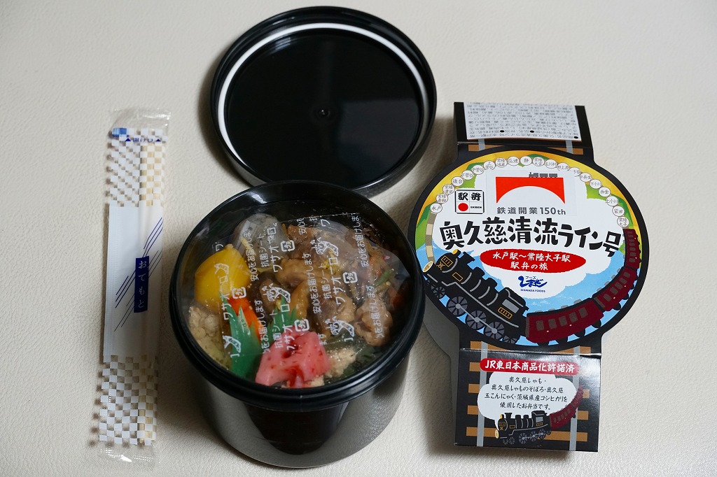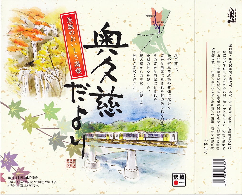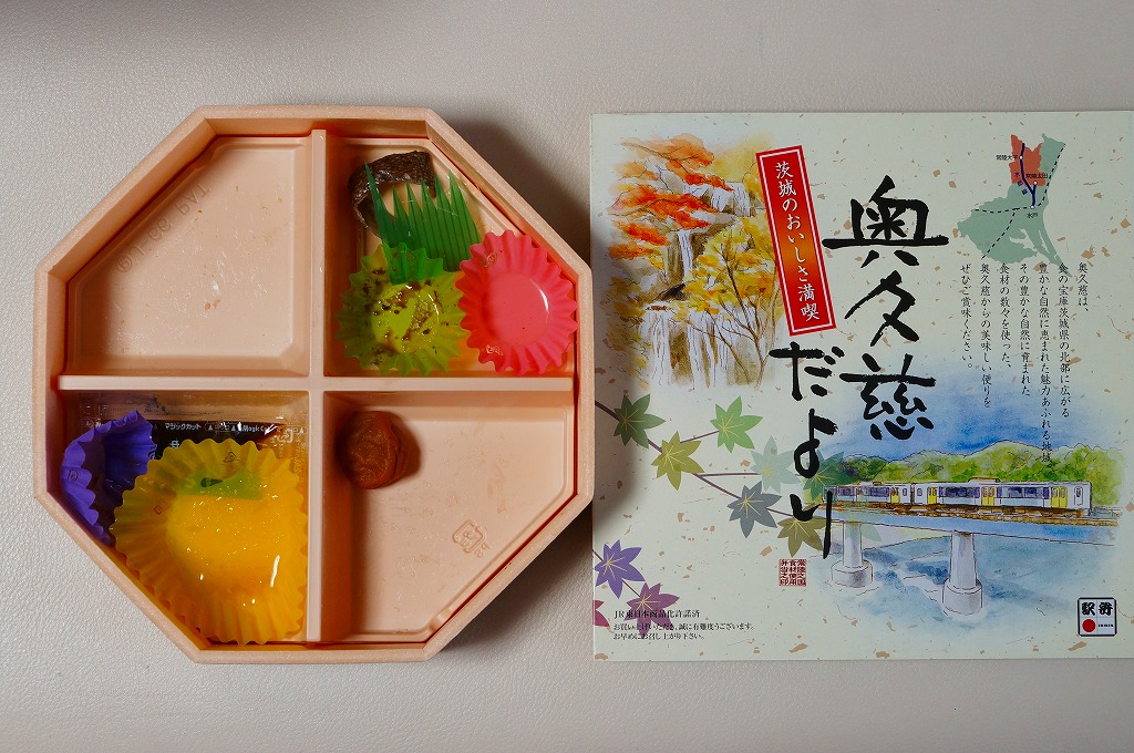 2012(平成24)年11月30日から12月2日まで「SL奥久慈清流ライン号記念弁当」の名で販売。翌2013(平成25)年10月に秋の駅弁「奥久慈だより」として再登場。正八角形の容器を4つに区切り、日の丸御飯、奥久慈しゃも飯、鮭塩焼とアユ甘露煮とクルミや黒豆やのり巻き揚げ、里芋コロッケやゴボウの唐揚げにゆばやカボチャなどの煮物と芋がら佃煮などを詰める。「茨城のおいしさ満喫」と書いてあり、これが茨城かどうかは洞察力を擁するが、おいしさは満喫できた。2014(平成26)年までの販売か。