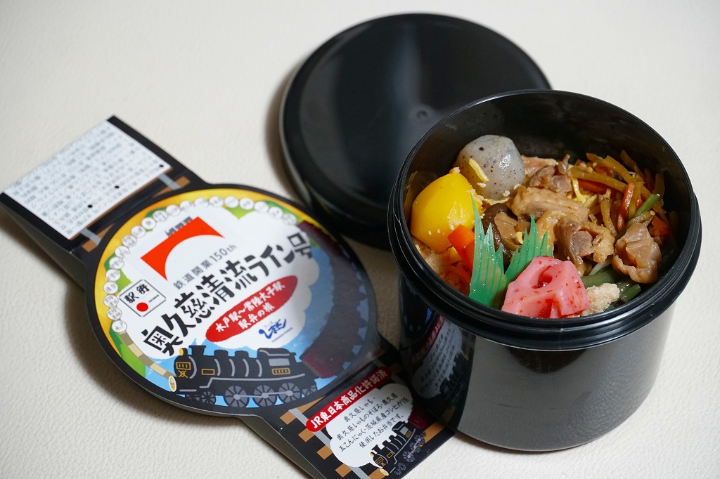 奥久慈清流ラインは、茨城県と福島県が公募により2011年8月に決めた、JR水郡線に対する路線愛称。市販の鉄道時刻表にも記載されるほか、以後に水郡線で運転された臨時快速列車やSL列車の名前にも付いた。最近5年間はあまりそんなことがなく、スリーブに描かれるような蒸気機関車が走ったのは2014年12月が最後であるが、なぜか不思議とこのタイミングで、まるでSL弁当のような駅弁が出てきた。