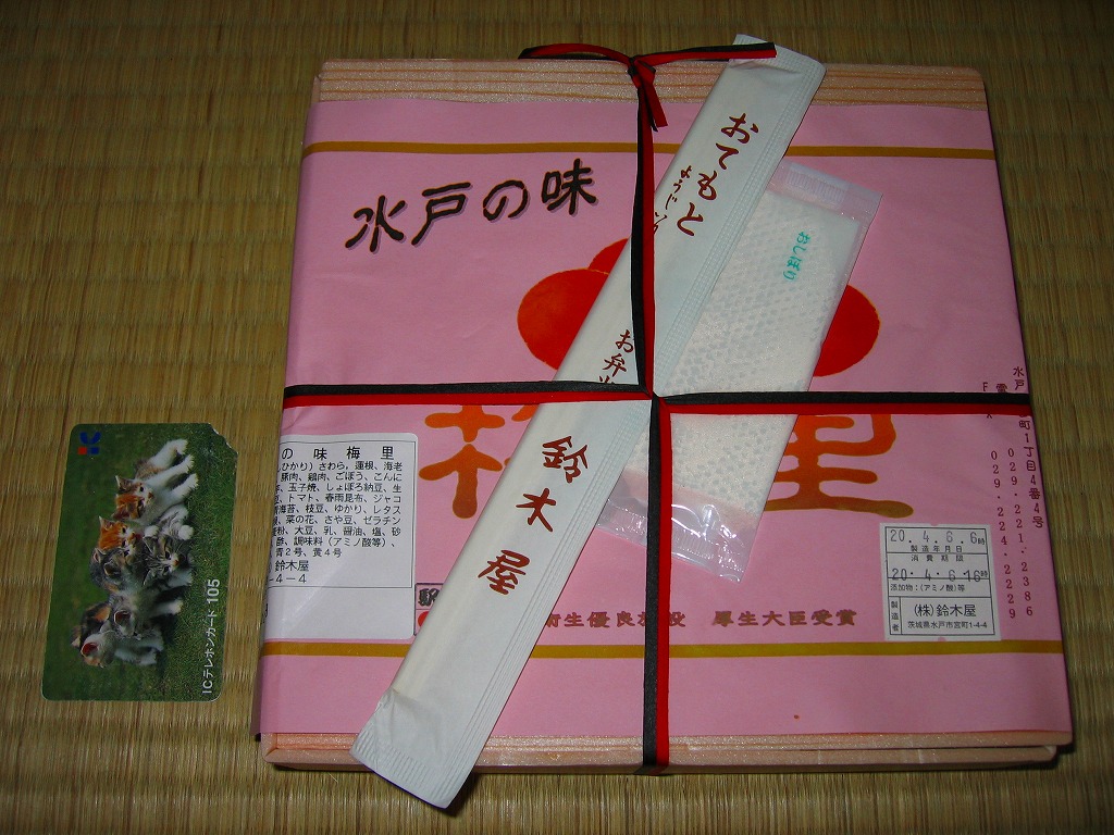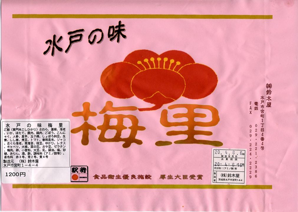2008(平成20)年の水戸の梅まつり期間限定駅弁として、2月23日から3月31日まで発売、その後も販売継続中である模様。強度のない正方形の木目調容器に、ピンク色の用紙にインクジェットプリンタで駅弁の名前などを書いた掛紙をかけて、ひもで十字にしばる。6区画に収まる中身は、ゆかりをかけた白御飯、シラスとサクラエビを少々かけた白御飯、サワラとイカとホタテ、海老やレンコンなどの揚げ物、豚肉や鶏肉のあんかけ、ニンジンや里芋などの煮物と玉子焼に納豆カップ。