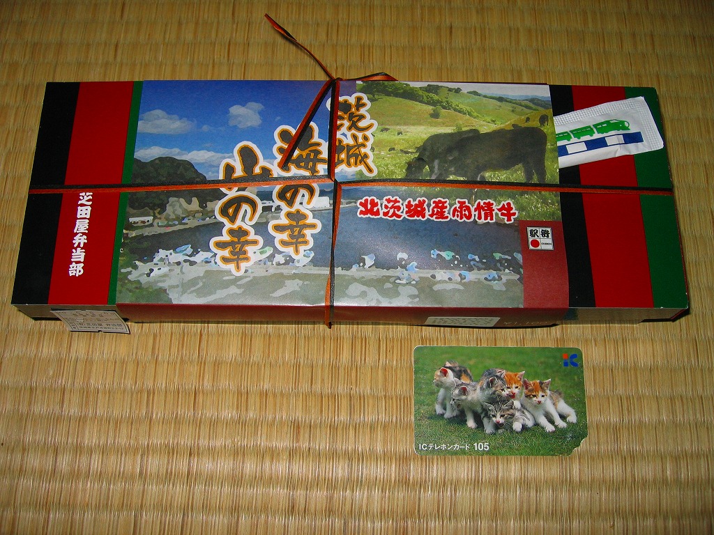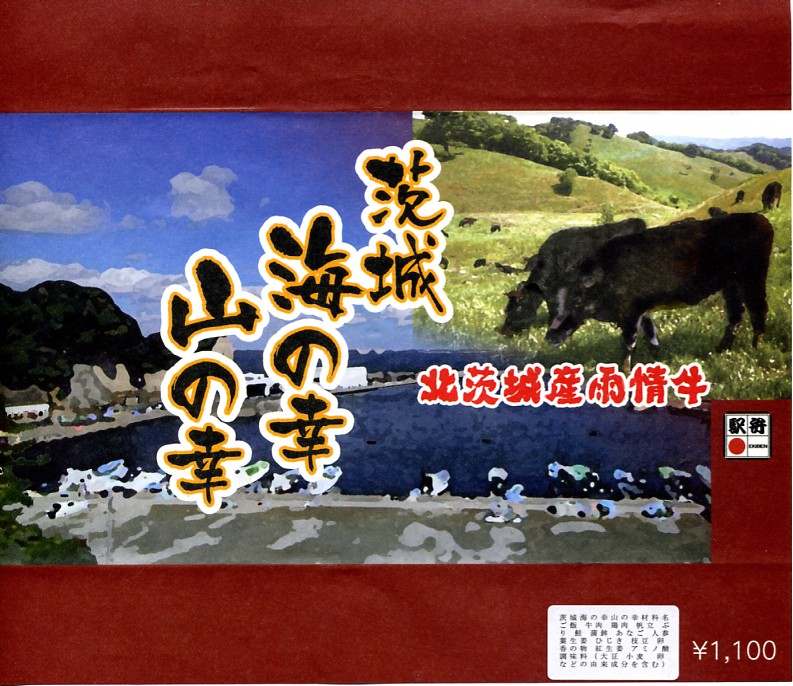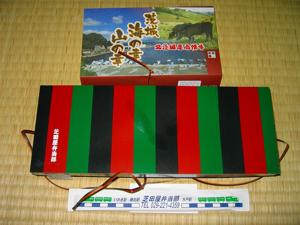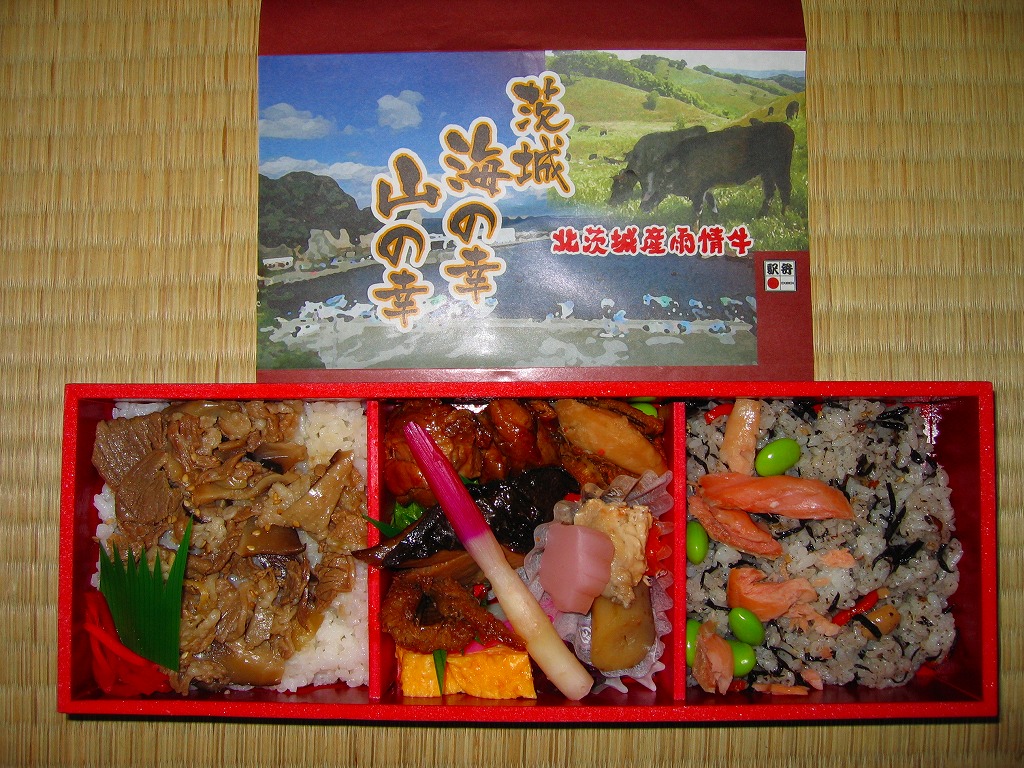 中身は既存の水戸駅弁「牛べん」と「磯べん」の組合せ。細長い容器の左側で白飯を牛肉煮で覆い大根桜漬を添え、右側でタコ飯を錦糸卵で覆い花かまぼこといんげん豆を添え、梅しゅうまい、玉子焼、サツマイモ、梅甘露煮をその間に配置する。味は確かですが、駅弁はどうもそんなに人気にはならなかった感じ。