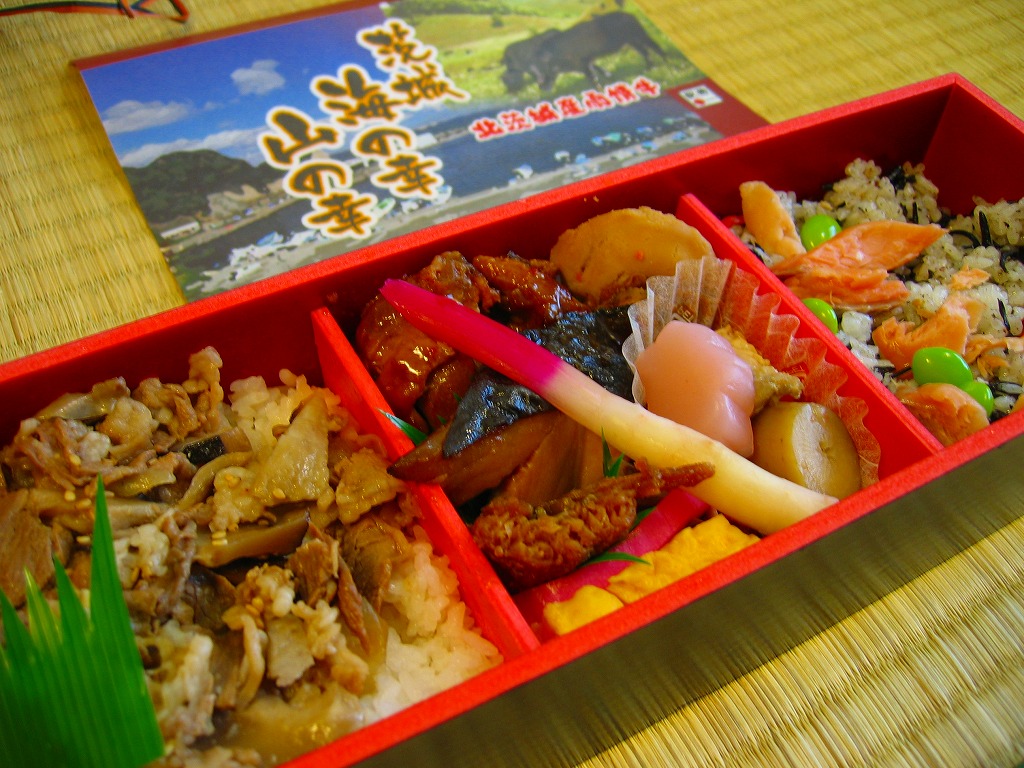 2008(平成20)年に発売か。細長い容器に、幕の内弁当に使われるようなデザインのボール紙でふたをして、海と山と駅弁の名前を描いた掛紙を巻いて、ひもで十字にしばる。中身は仕切りで3分割され、左に牛丼、右に鮭ひじき御飯、真ん中がおかずでブリ照焼、煮ホタテ、鶏照焼、煮穴子、カマボコ、玉子焼など。