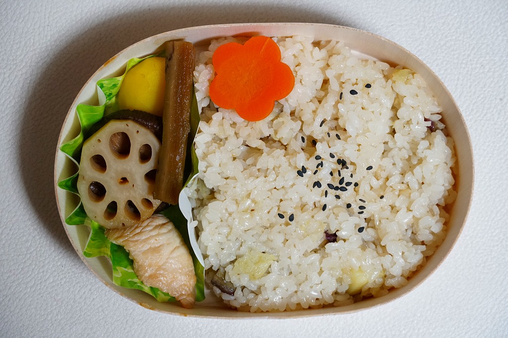 2024(令和6)年8月23日に水戸駅で発売。10月のJR東日本の駅弁キャンペーン「駅弁味の陣2024」にエントリー。商品名と色で芋を思わせる掛紙を巻いた、長円形の容器に茨城県産さつまいもの炊き込みご飯を詰め、茨城県産花人参煮、茨城県産ごぼう甘辛煮、笠間の栗、茨城県産れんこん、つくば鶏照焼、しいたけ煮を添える。おいもの甘さによりおかず要らずでいただける芋ごはんがおいしい。それに、酸味も辛味も苦味もないのがありがたい。サツマイモは薩摩芋というくらいなので鹿児島県が日本一の産地であるが、第2位は茨城県であり、シェアも3割強と3割弱であまり変わらないから、茨城の名物といって差し支えない。