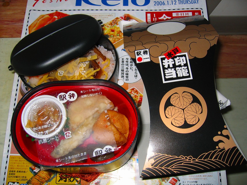 水戸駅の駅弁「印籠弁当」の、2006(平成18)年時点での姿。印籠形の黒いプラ容器をスリーブに収めるようになり、3段重ねから2段重ねに変わり、一方で下段に内容器を挿入することで中身は3段分のままである。中身は上段が椎茸と海老とタケノコのちらしずし、中段がワカサギ揚げやレンコン揚げや納豆カップなど、下段が御飯と豚肉という具合に、だいぶリニューアル。価格も50円の値上げ。