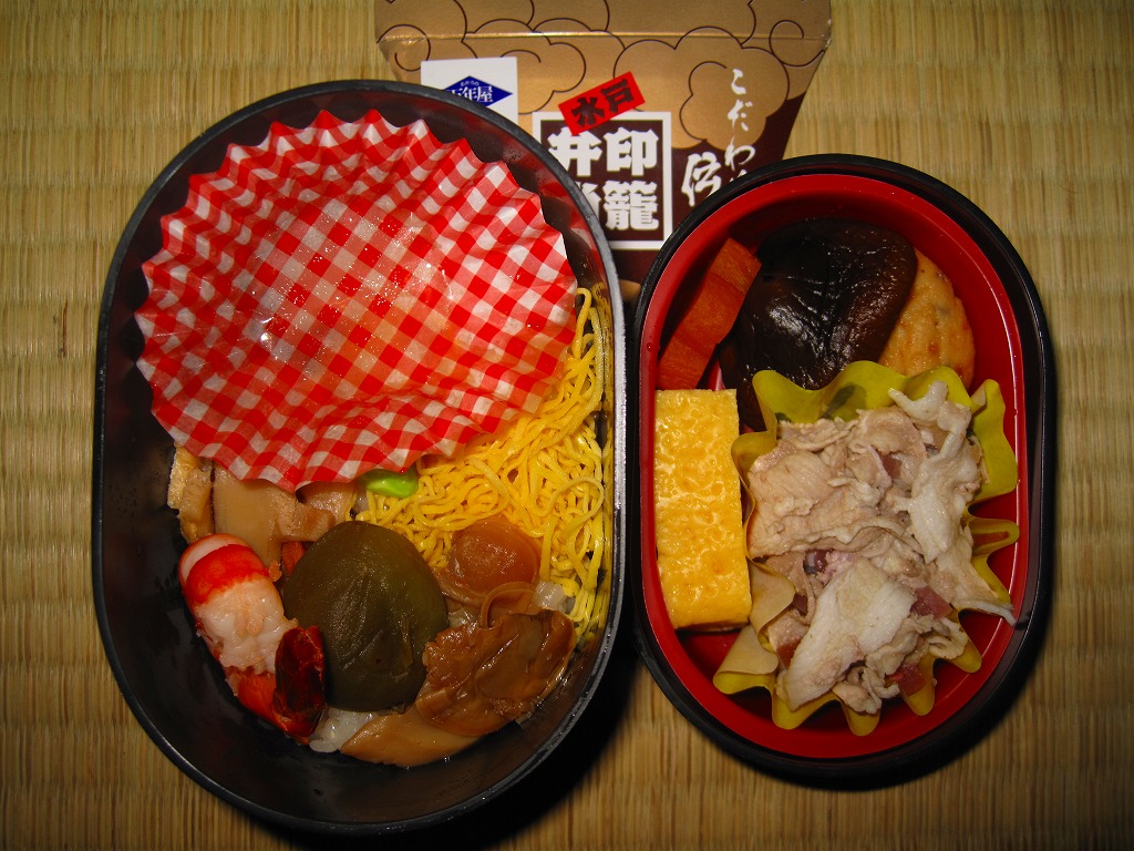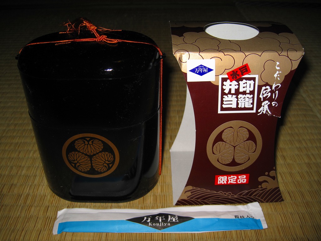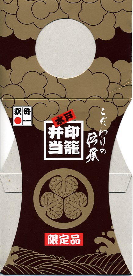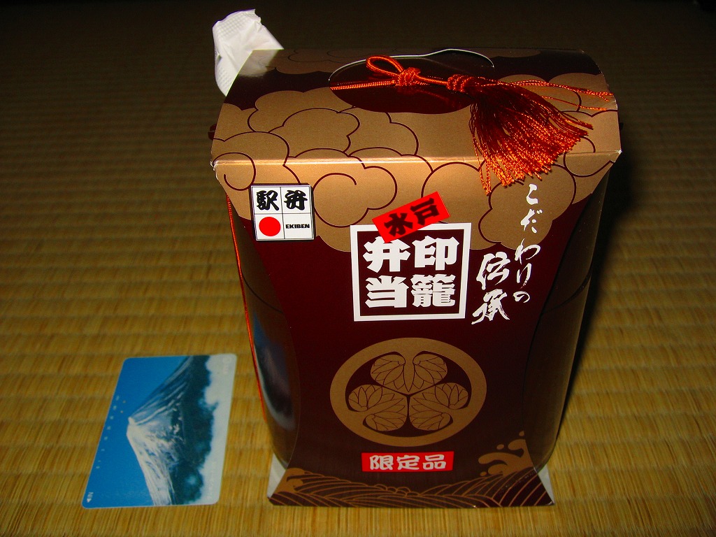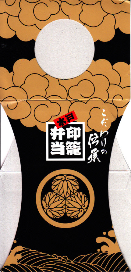 水戸駅の駅弁「印籠弁当」の、2001(平成13)年時点での姿。徳川家の葵の御紋と「水戸黄門」の文字を金色でプリントした、印籠の形を模した黒いプラ容器の、下段にじゃこ入り豆御飯、中段に椎茸やエビが載った手まり寿司が4つ、上段に角煮と煮物類を詰める。季節により変化する中身は、印籠〜携帯用薬箱〜健康という流れで、健康に良い食材で構成したという。おかず向けの食材が少ないとはいえ、淡泊で体に良さそうな味が出ている。2006年までに上記のとおり容器をリニューアル。