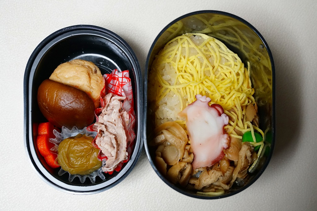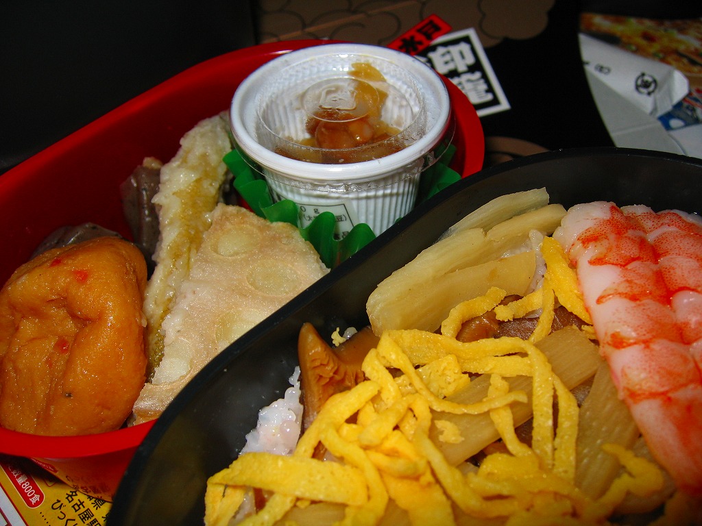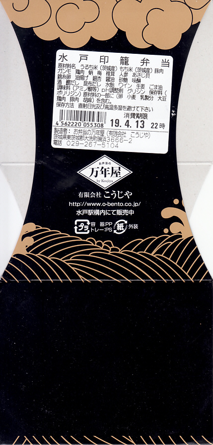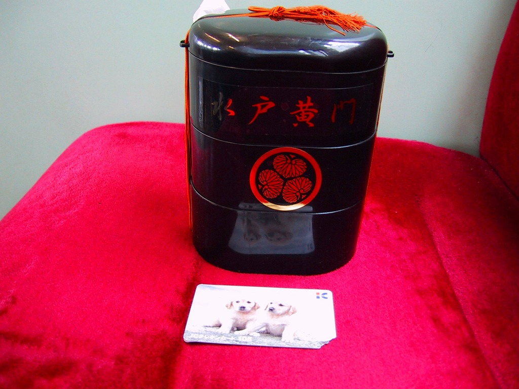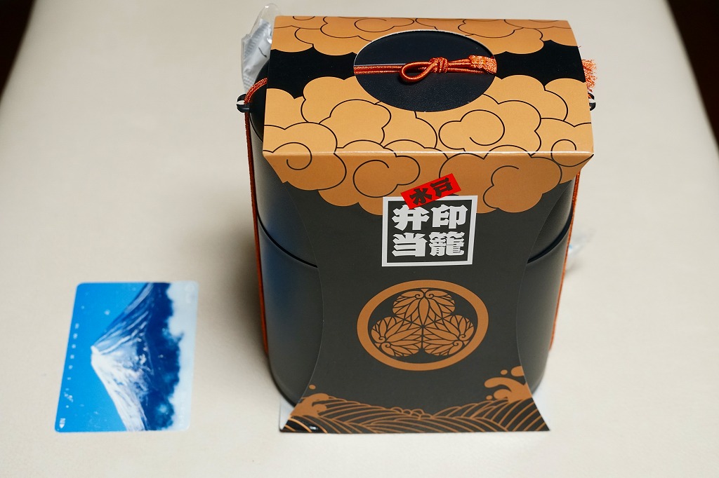 水戸駅の駅弁「印籠弁当」の、2001(平成13)年時点での姿。徳川家の葵の御紋と「水戸黄門」の文字を金色でプリントした、印籠の形を模した黒いプラ容器の、下段にじゃこ入り豆御飯、中段に椎茸やエビが載った手まり寿司が4つ、上段に角煮と煮物類を詰める。季節により変化する中身は、印籠〜携帯用薬箱〜健康という流れで、健康に良い食材で構成したという。おかず向けの食材が少ないとはいえ、淡泊で体に良さそうな味が出ている。2006年までに上記のとおり容器をリニューアル。