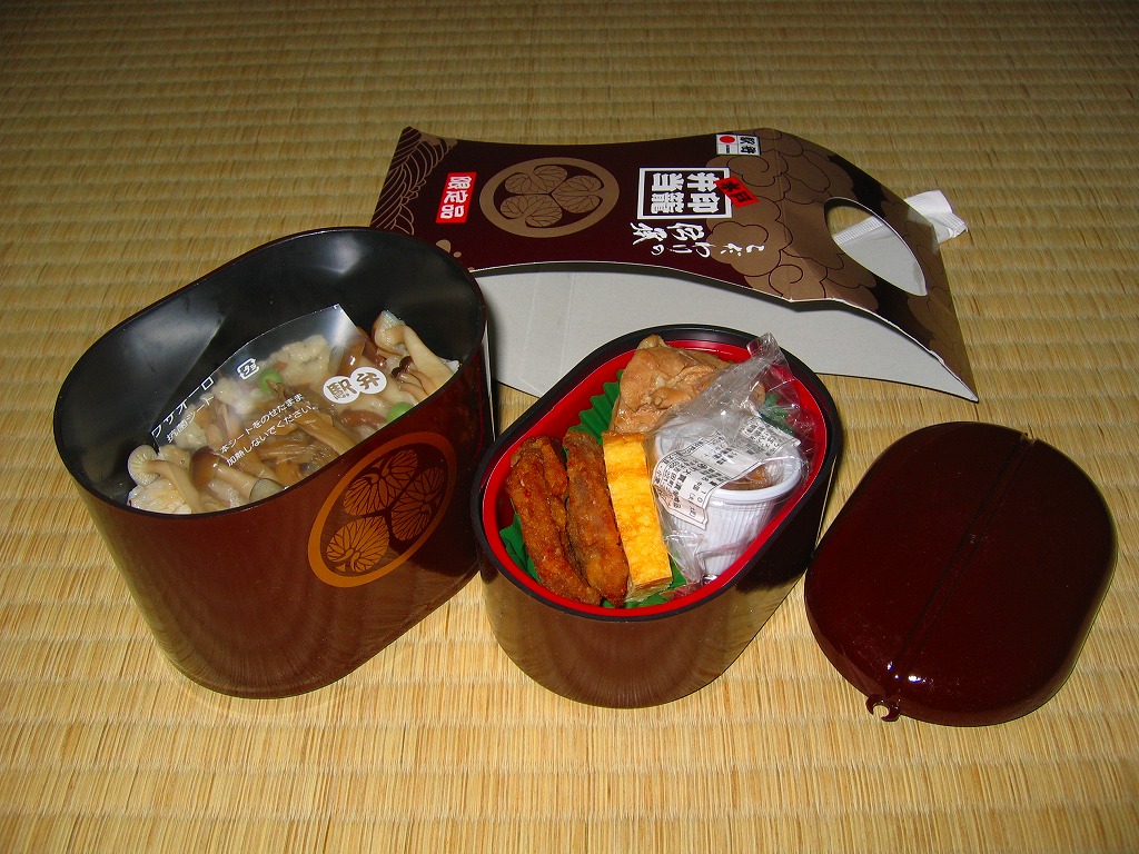 2006(平成18)年秋の新作。下記の駅弁「印籠弁当」の黒いプラ容器を、漆塗り風の赤黒い色に変更し、中身も3段分から2段に変更。下段に茨城産「黄門米」を使ったしめじと椎茸の炊込飯に舞茸を載せる御飯をたっぷり詰め、上段に鶏肉2点と豚肉、玉子焼き、カップ納豆を詰めた。