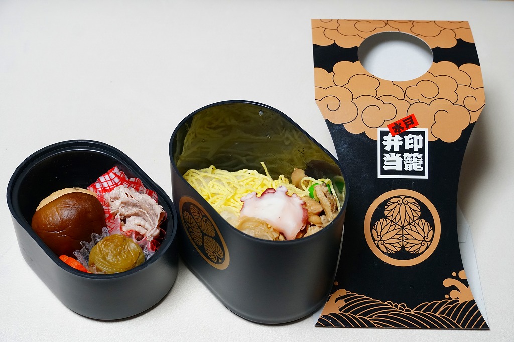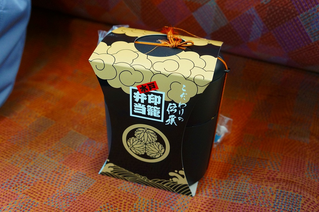 1995(平成7)年に水戸駅で発売。江戸時代の携帯薬箱であり、昭和時代を代表する人気のテレビドラマ「水戸黄門」における重要なアイテムであった印籠を、水戸で駅弁の容器にした。印籠の形状をイメージした黒い二段重ねのプラ製容器の、下段に炊込飯を詰めてハマグリ、タコ、錦糸卵で覆い、上段に豚肉、煮物、梅甘露煮を詰める。テレビドラマのレギュラー放送が終了したため、そろそろ水戸と印籠のつながりに説明を要しそうだが、今でもここにしかない形の駅弁として販売が続く。2010年の水戸駅弁の断絶を乗り越えた、唯一の駅弁である。価格は2010年の引き継ぎ時で大洗駅にて1,000円、2014年時点で1,080円、2023年時点で1,200円。