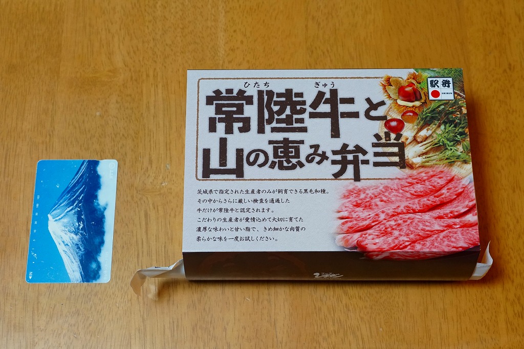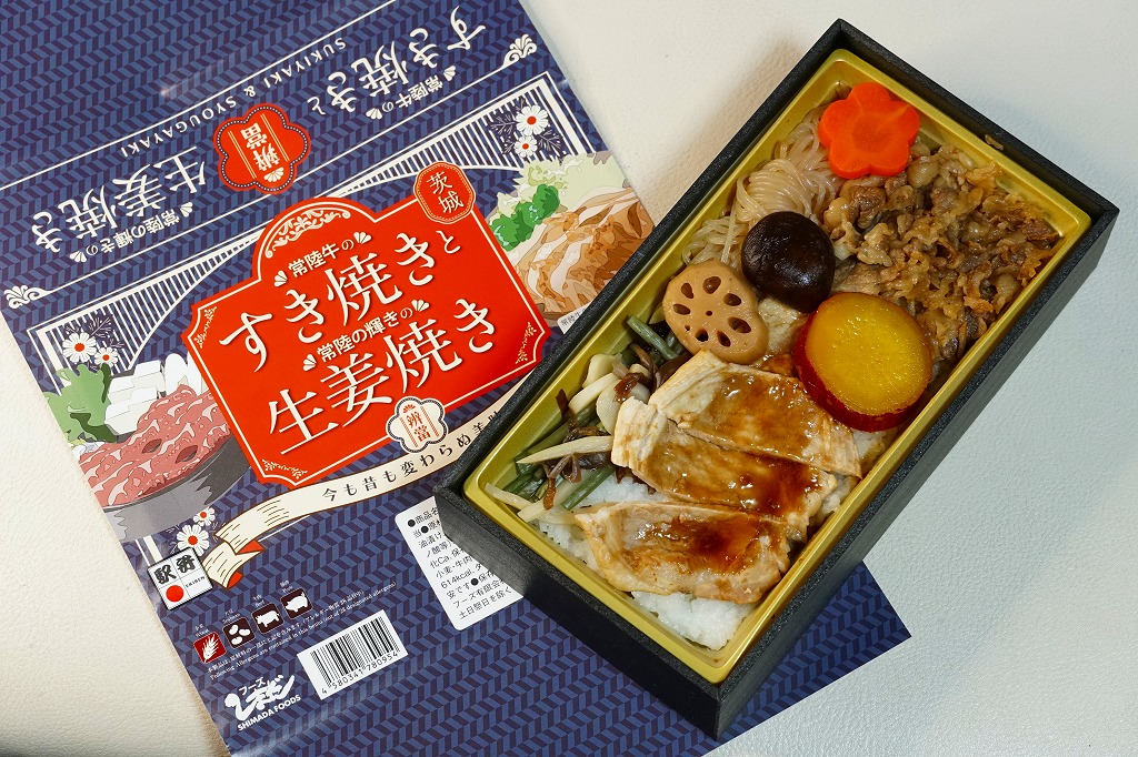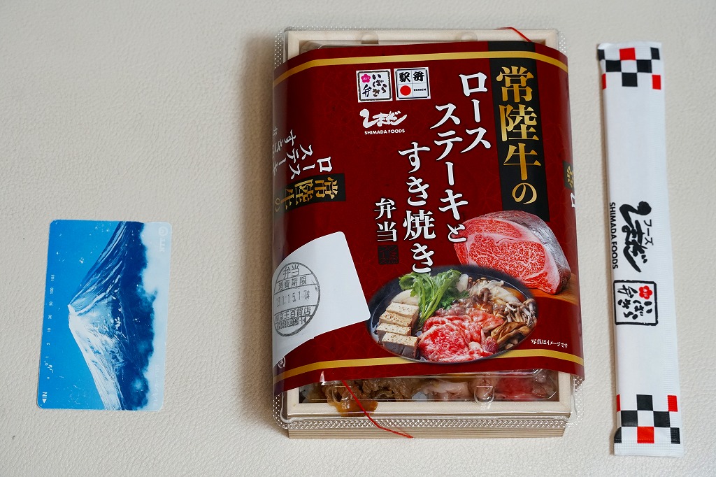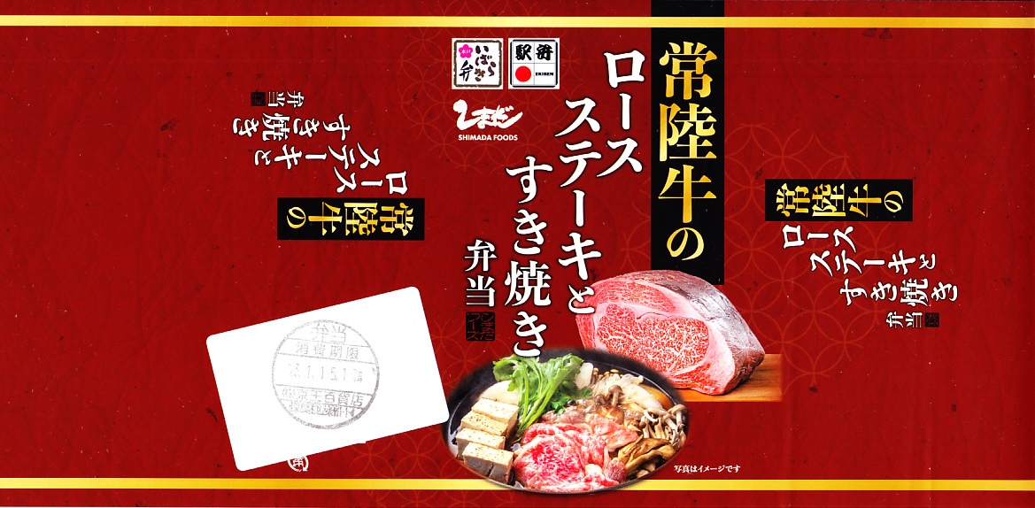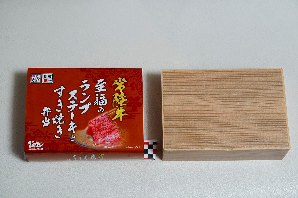 長方形のプラ容器に白飯を詰め、牛肉のすき焼きと豚肉の生姜焼きを載せ、山菜やさつまいもなどを添える。御飯は茨城県産米、牛肉は茨城県常陸牛振興協会が認定した黒毛和牛「常陸牛」、豚肉は茨城県畜産センターが開発し2018年から販売されるブランド豚「常陸の輝き」と、食材の大部分を茨城で固めたものの、いずれも一般的な食材であり、弁当にすると味の差もないので、掛紙の小さな文字を読まないと気付かないと思う。キャンペーンや現地での存在感はいかに。価格は2023年時点で1,380円、2025年時点で1,390円。