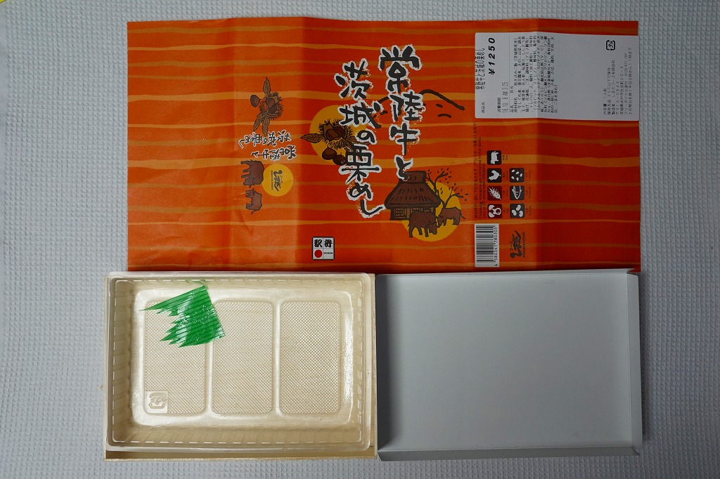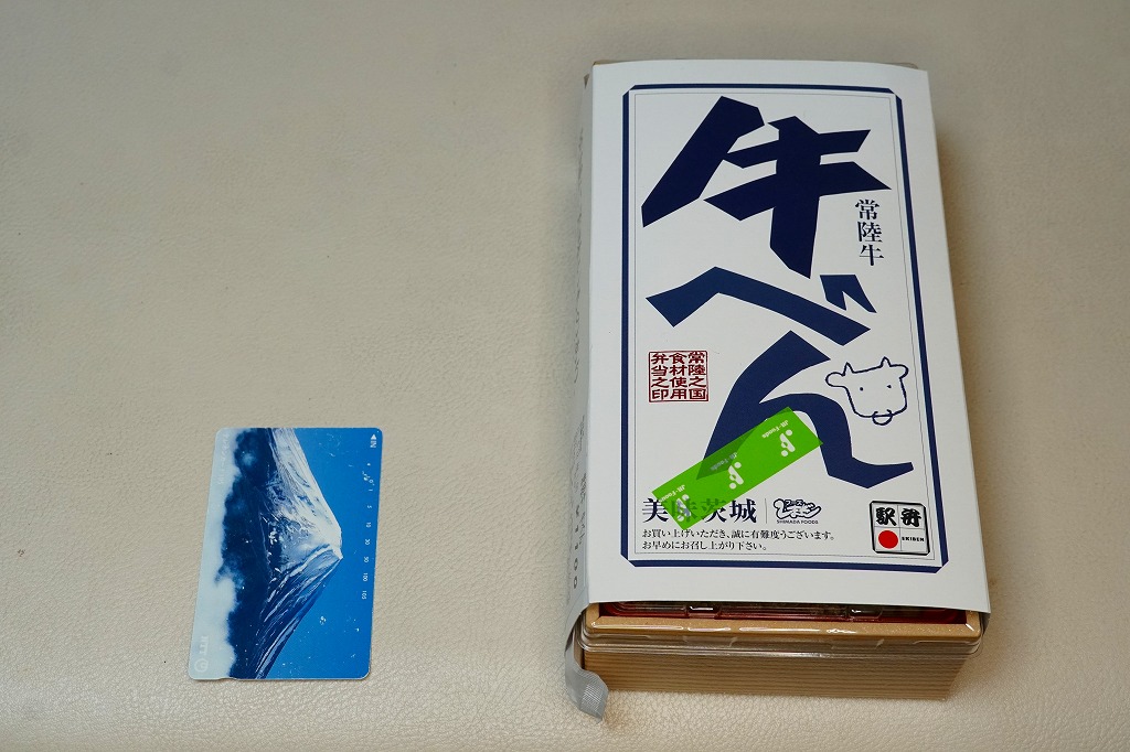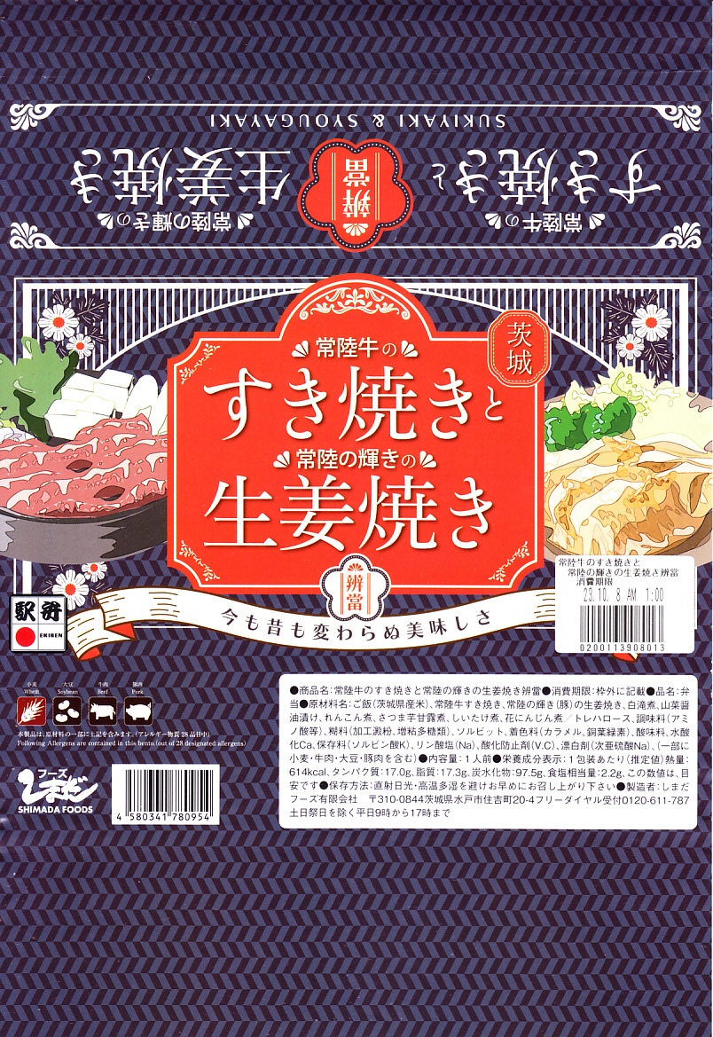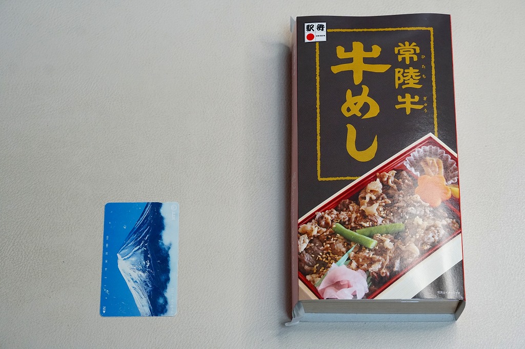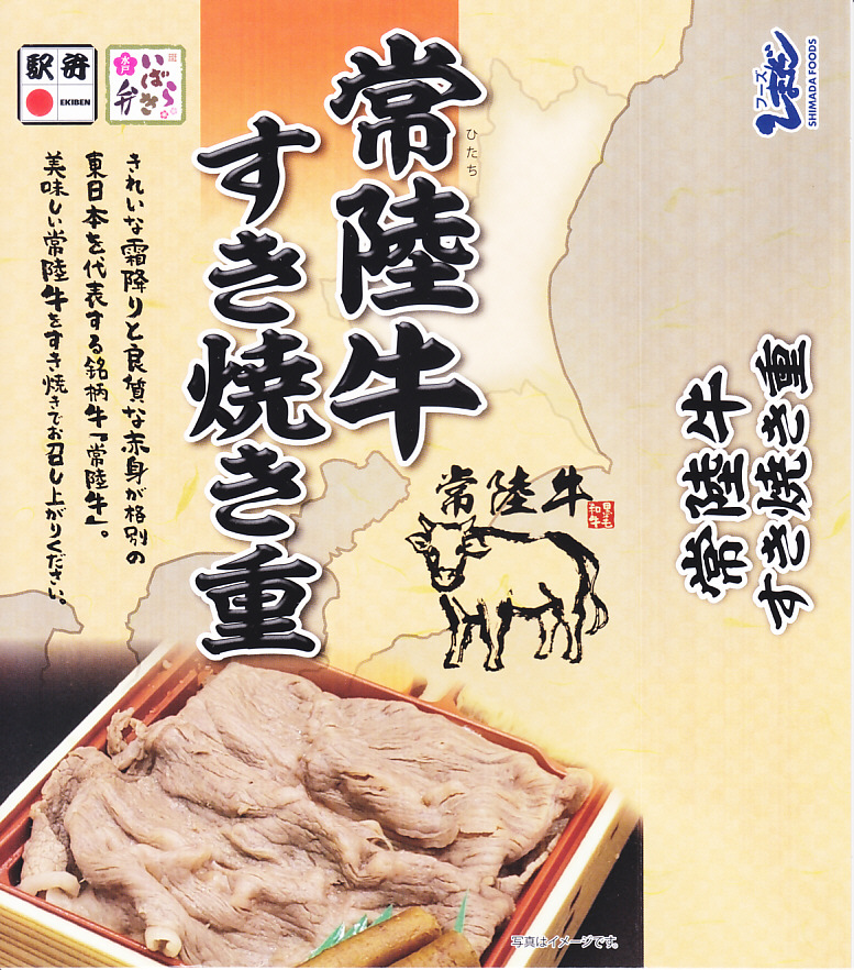 長方形のプラ容器に白飯を詰め、牛肉のすき焼きと豚肉の生姜焼きを載せ、山菜やさつまいもなどを添える。御飯は茨城県産米、牛肉は茨城県常陸牛振興協会が認定した黒毛和牛「常陸牛」、豚肉は茨城県畜産センターが開発し2018年から販売されるブランド豚「常陸の輝き」と、食材の大部分を茨城で固めたものの、いずれも一般的な食材であり、弁当にすると味の差もないので、掛紙の小さな文字を読まないと気付かないと思う。キャンペーンや現地での存在感はいかに。価格は2023年時点で1,380円、2025年時点で1,390円。