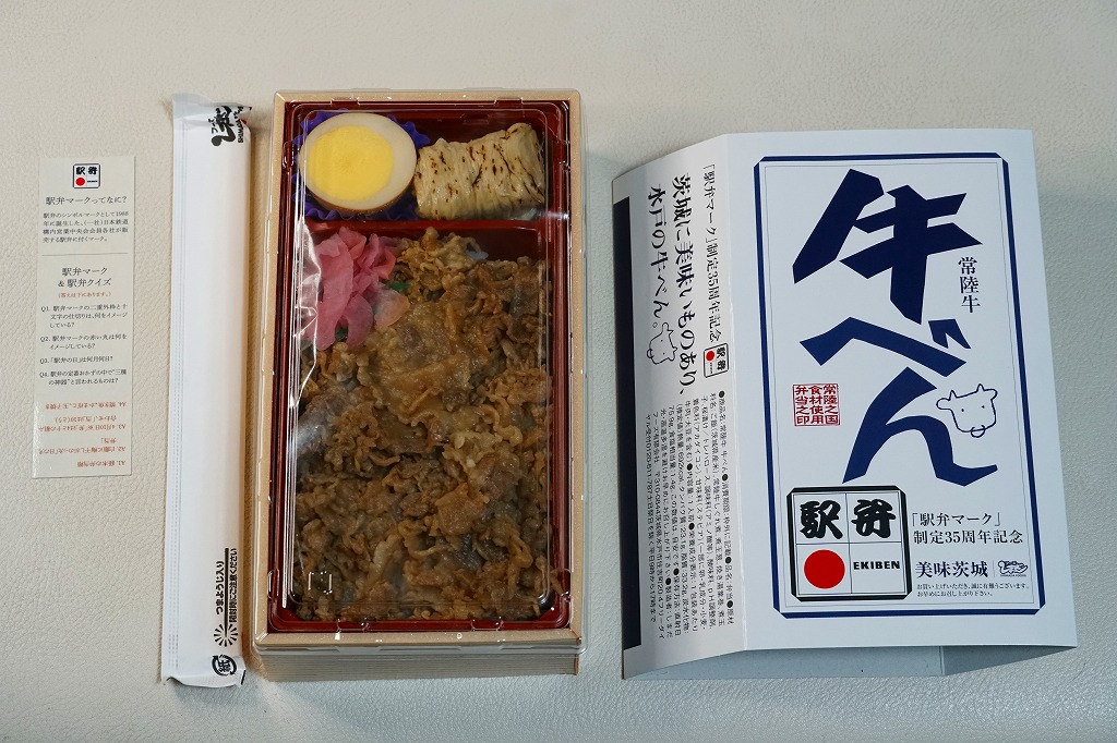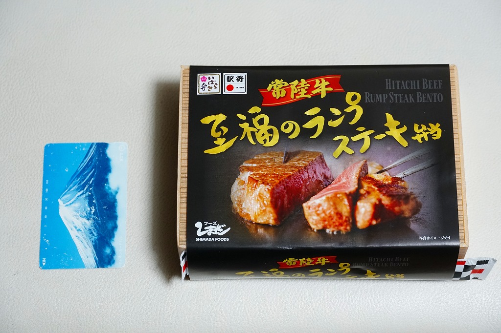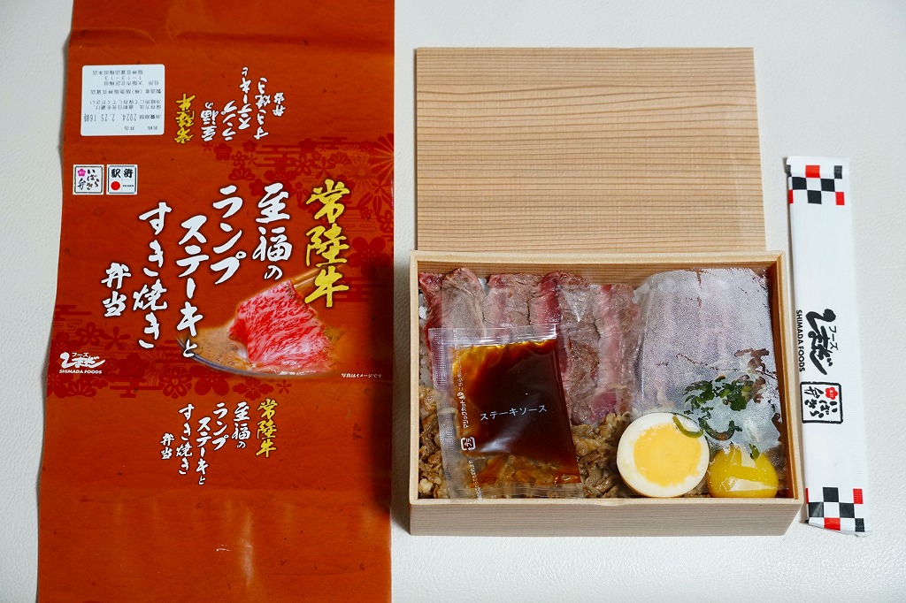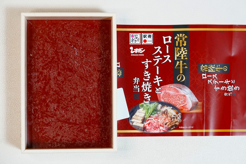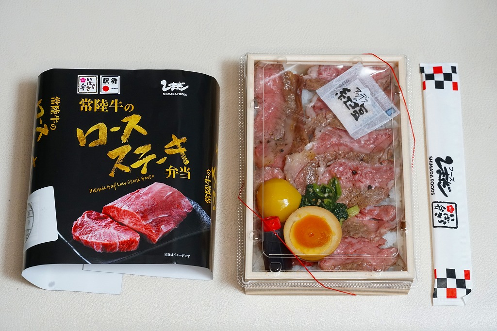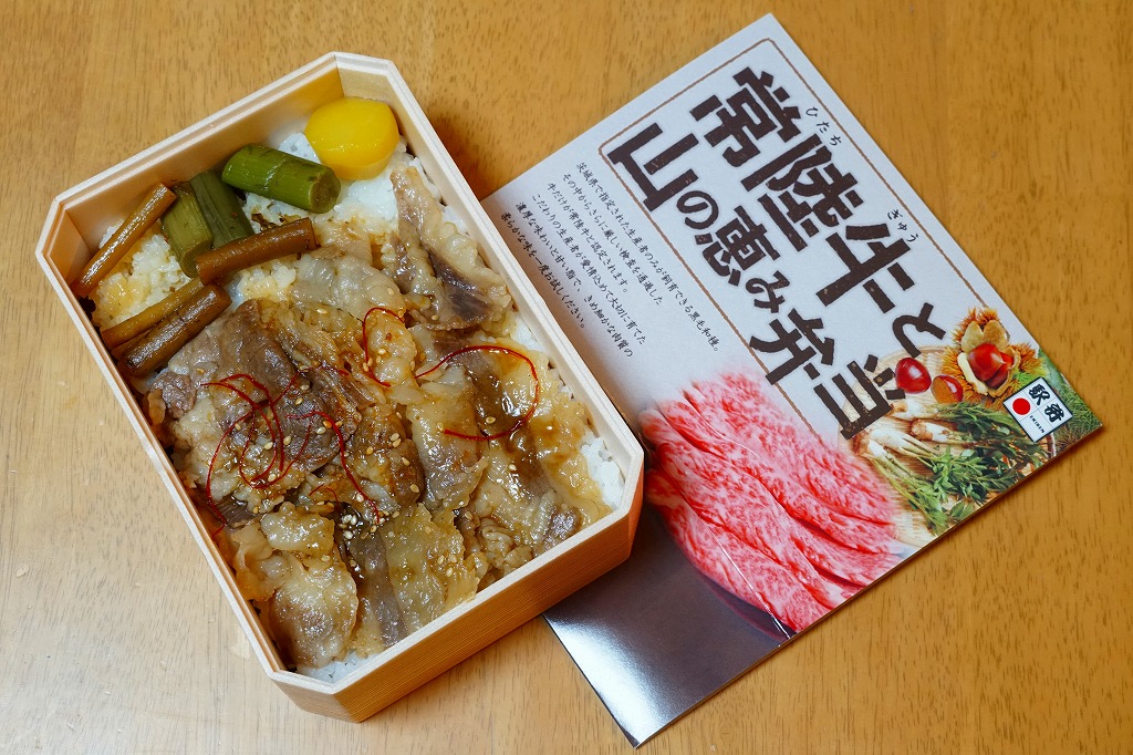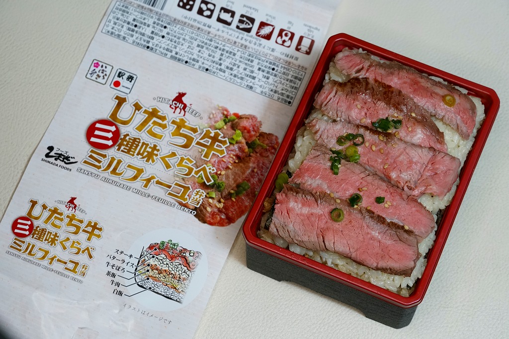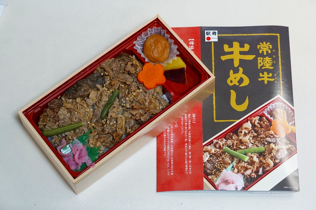 2023(令和5)年1月の京王百貨店の駅弁大会で、これと 「常陸牛のロースステーキ弁当」と「常陸牛のロースステーキとローストビーフ贅沢盛り弁当」の3種を、水戸駅の駅弁として実演販売。最も安価なこれは、長方形の容器に白飯を詰め、常陸牛のロースステーキと牛肉煮で半分ずつ覆い、くりと青菜と煮玉子とタレと紅塩を添え、食材の写真が美しい赤い掛紙を巻いた。まだ赤くて噛み切れない牛ステーキと、干物のように味が濃縮した牛すき焼きが印象的で、こんな駅弁は見たことがない。駅弁を売る水戸駅のコンビニで見ることが、できたかどうか。