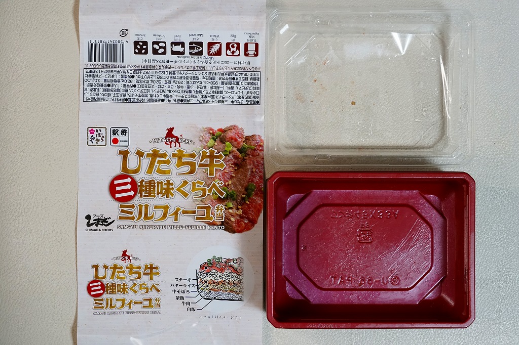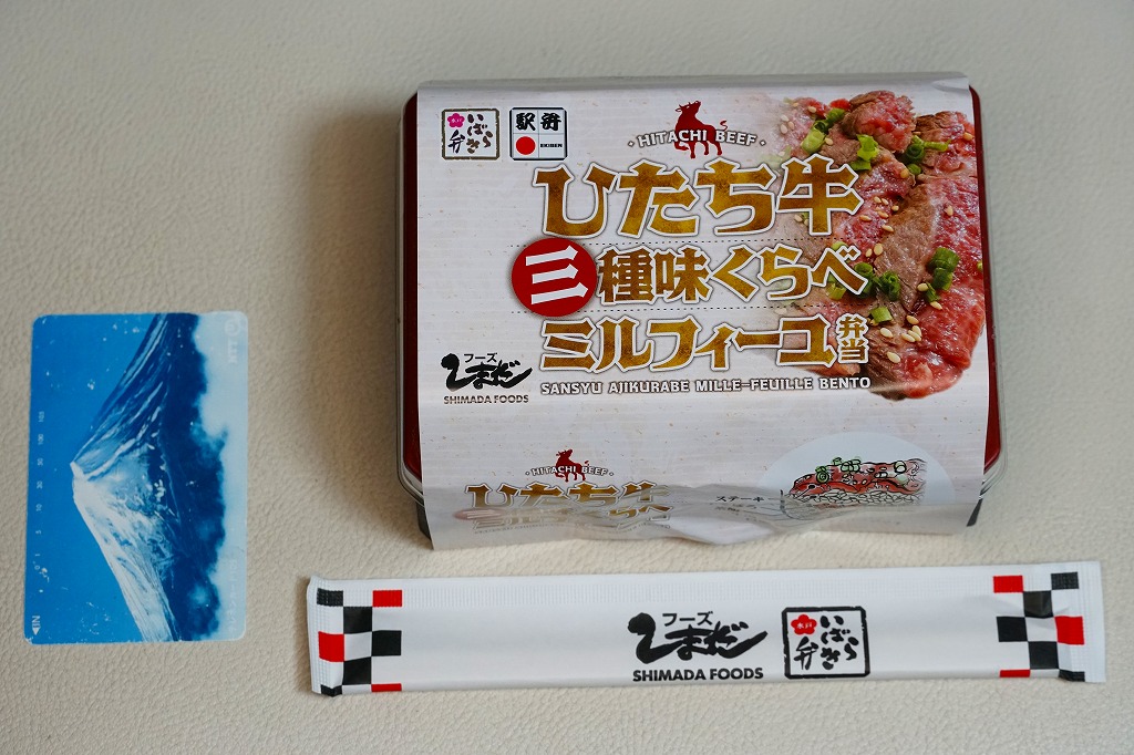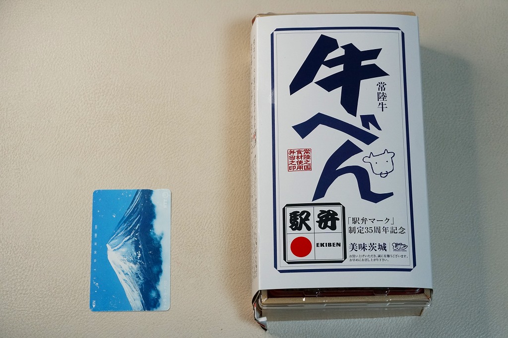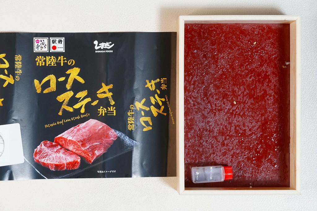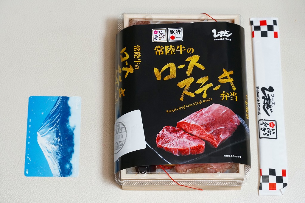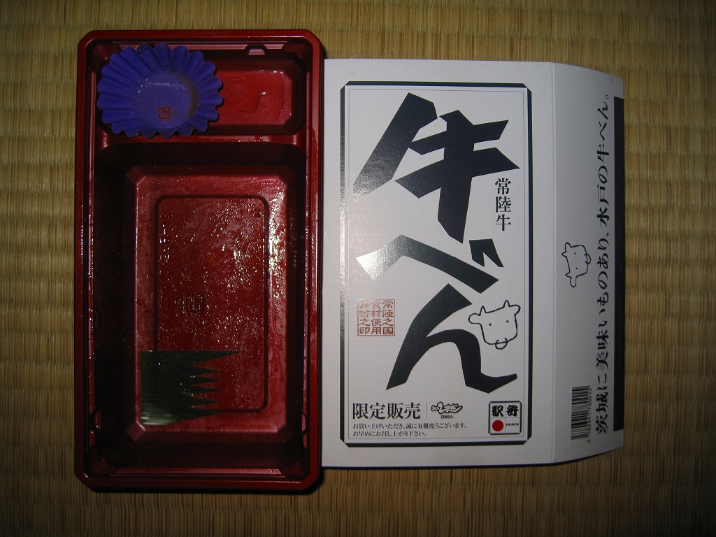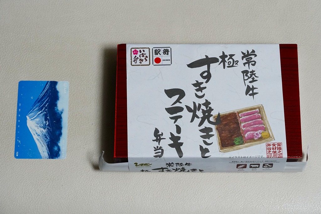 2023(令和5)年1月の京王百貨店の駅弁大会で、これと 「常陸牛のロースステーキ弁当」と「常陸牛のロースステーキとローストビーフ贅沢盛り弁当」の3種を、水戸駅の駅弁として実演販売。最も安価なこれは、長方形の容器に白飯を詰め、常陸牛のロースステーキと牛肉煮で半分ずつ覆い、くりと青菜と煮玉子とタレと紅塩を添え、食材の写真が美しい赤い掛紙を巻いた。まだ赤くて噛み切れない牛ステーキと、干物のように味が濃縮した牛すき焼きが印象的で、こんな駅弁は見たことがない。駅弁を売る水戸駅のコンビニで見ることが、できたかどうか。