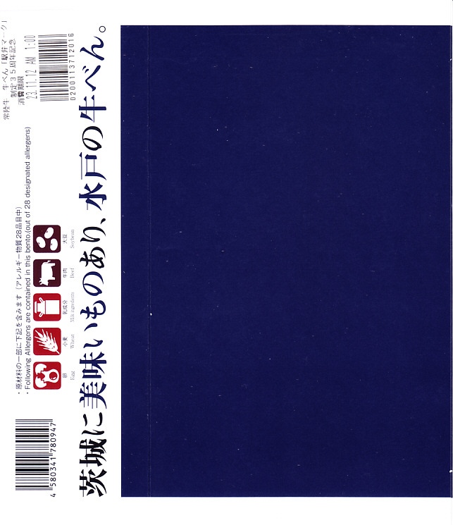2023(令和5)年11月11日に購入した、水戸駅弁のスリーブ。日本鉄道構内営業中央会の「駅弁マーク」制定35周年を記念し、会員のうち29社が主に11月10日から期間限定で販売した31種類の記念駅弁のうち、水戸駅の駅弁屋のもの。既存の水戸駅弁で、2011年の新生水戸駅弁の一番手であった上記の「牛めし」のスリーブを、大きめの駅弁マークと「「駅弁マーク」制定35周年記念」の文字を入れたものに差し替えた。容器と中身と価格は変わらない。普段の水戸駅や勝田駅や東京駅などに加えて、新大阪駅や京都駅でも販売したそうな。