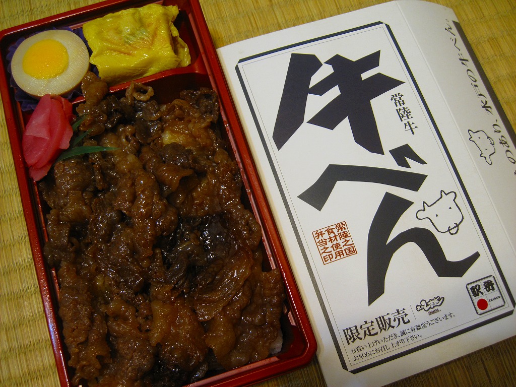 2011(平成23)年4月までに、水戸駅で発売か。白飯の上を常陸牛のしぐれ煮で覆い、高野豆腐のゆば巻きと煮玉子などを添える。内容こそ全国でありふれた牛肉駅弁であるものの、牛肉が飯の上で厚めに踊り、筋の固い赤身に分量豊かで溶ける脂身がぐにゃぐにゃにまとわりつき、B級グルメ感が強烈。価格は2011年の発売時で1,000円、2014年時点で1,050円、2020年時点で1,100円、2023年時点で1,250円、2024年9月20日から1,350円。