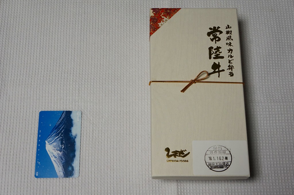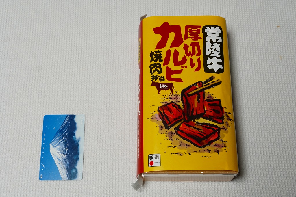 2019(平成31)年1月の京王百貨店の駅弁大会での実演販売でデビュー。牛そぼろ飯を駅弁の名前どおりの常陸牛厚切りカルビ焼肉で覆い、玉子焼、小松菜、梅れんこんを添える。メインの厚切り焼肉はにゅるにゅるで噛み切れず。さすが牛めしや豚めしで駅弁デビューした調製元だというB級グルメ感で、値段は高級駅弁なので、華美な商品が競う催事場では苦戦しているように見えた。その後に東京駅や水戸駅でこの姿のまま販売されたようで、その肉の風味はどうだろうか。価格は2019年の発売時や購入時で1,600円、2023年時点で1,680円、2025年時点で1,690円。