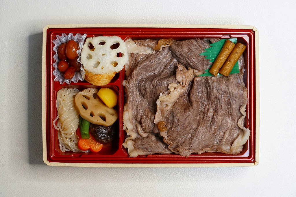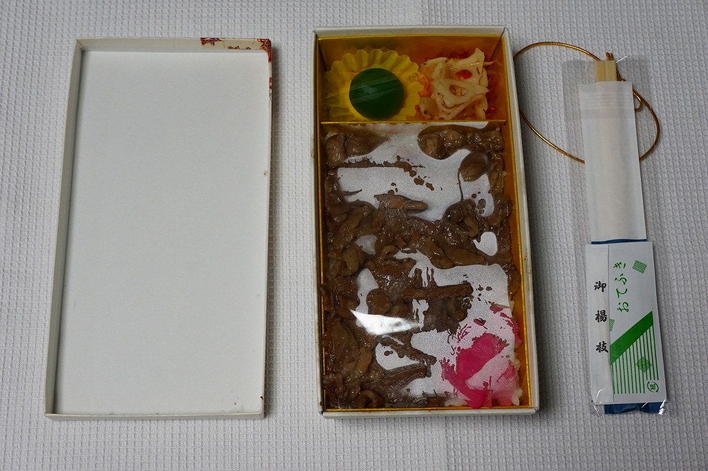 2024(令和6)年1月の京王百貨店の駅弁大会と2月の阪神百貨店の駅弁大会で、これと「常陸牛至福のランプステーキ弁当」と「至福のランプステーキローストビーフ贅沢盛り弁当」を実演販売。小柄な長方形の容器に白飯を詰め、常陸牛のランプステーキの切り身とすき焼き肉をきれいに並べ、ナムルと玉子とくりを添える。これはこれは前年に同じ場所で実演販売した弁当「常陸牛のロースステーキとすき焼き弁当」と、同じものではないだろうか。味は違い、ステーキは形が整い、すき焼きは柔らかくなり、シンプルでおいしい牛丼になって、200円の値下げ。これもはたして、水戸駅で売られることは、あるのだろうか。