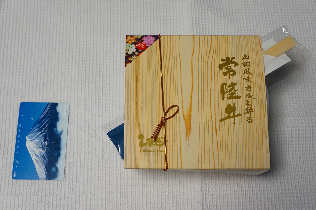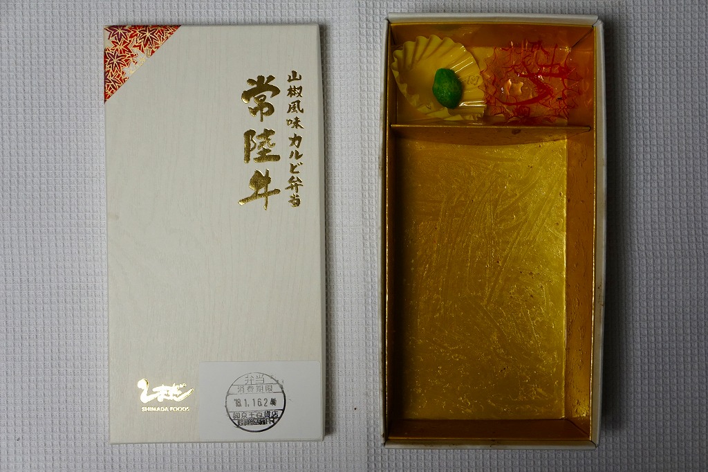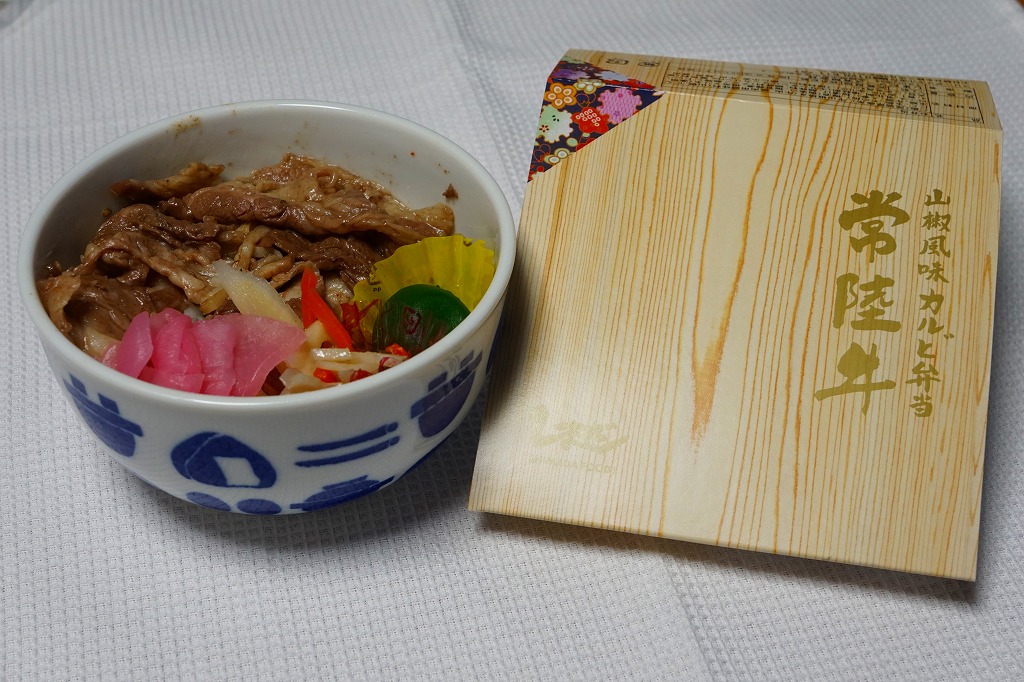 白木に金文字を押したような高級感のあるボール紙製容器を使う。これに茨城県産コシヒカリの白飯を敷き、常陸牛カルビ焼山椒風味で覆い、根菜のマリネと青梅の甘露煮を添える。水戸の酒造メーカー「名利酒類」の梅酒と山椒を使用した特製タレに漬け込んで焼き上げたという、牛の香りと肉の味付けがよく効いているが、常陸牛の特性なのかどうか、筋が勝り噛み切れない肉質には難儀した。水戸駅弁「牛べん」の上等版といった感じの、高級なB級牛丼駅弁。2019年に終売か。