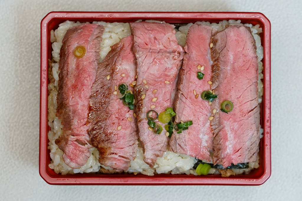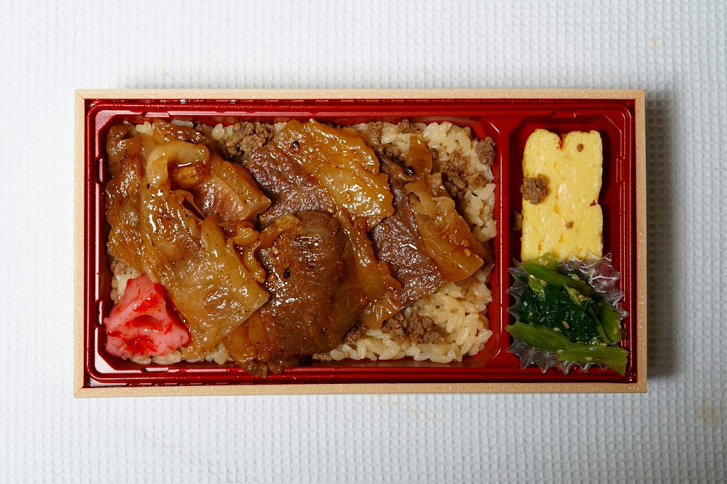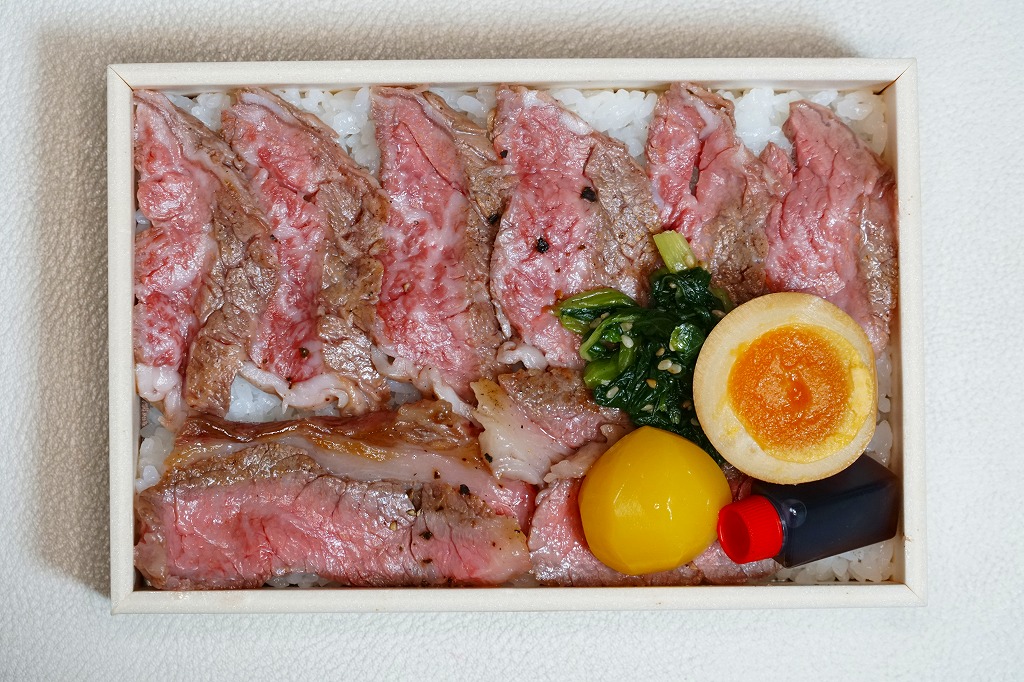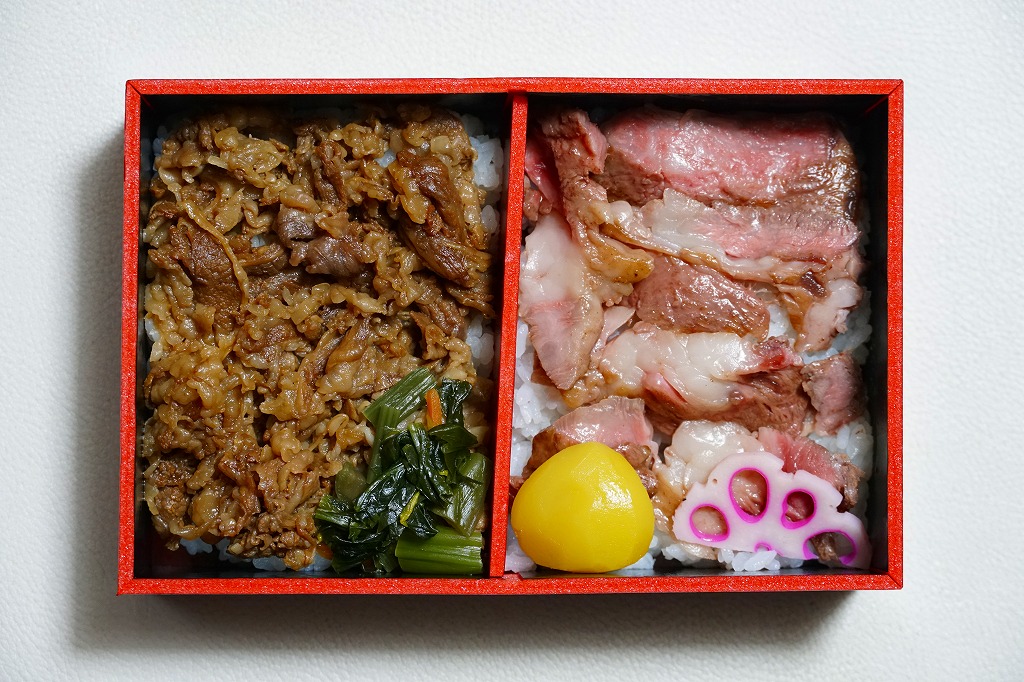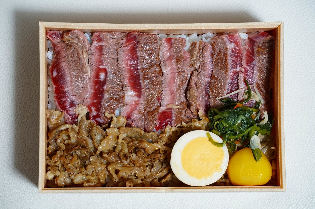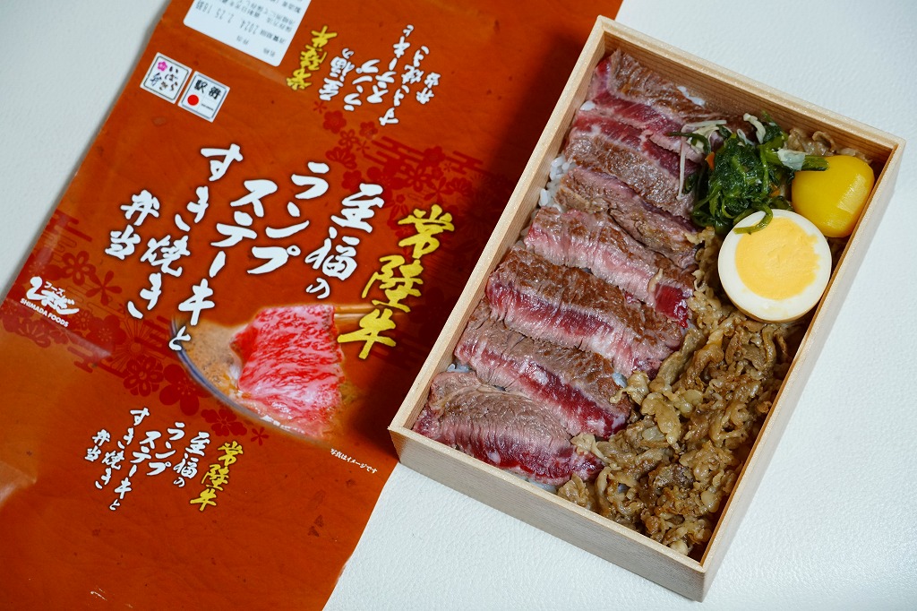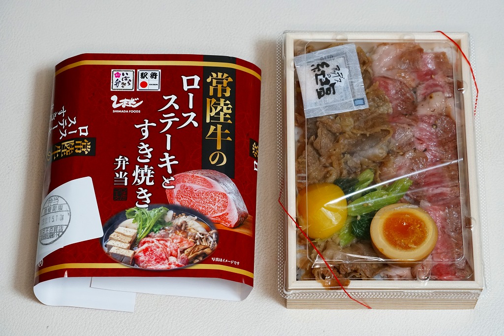 2022(令和4)年1月の京王百貨店の駅弁大会で実演販売。容器の半分が、白御飯を牛肉煮で覆うすき焼き丼、半分が白御飯を牛焼肉で覆うステーキ丼。茨城県のブランド牛である常陸牛(ひたちぎゅう)を使うといい、たしかに脂が豊かでおいしく、そのためにこれだけ高額な弁当となったのだろう。これが水戸駅で売られるかは分からないが、肉の質と味にこだわらなければ、上記や下記のとおり似た駅弁は買える。
