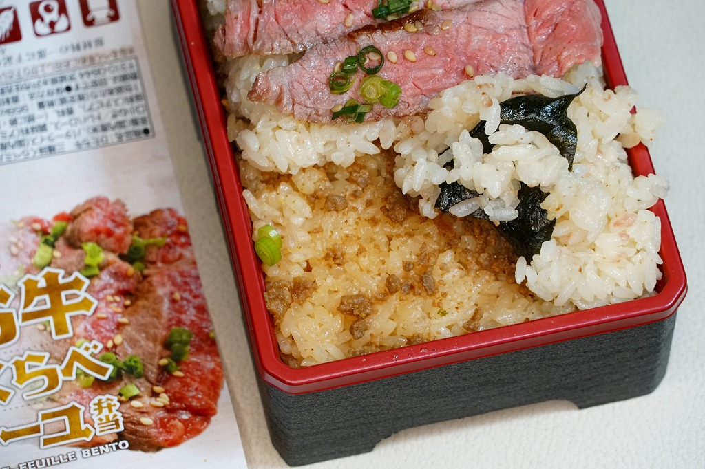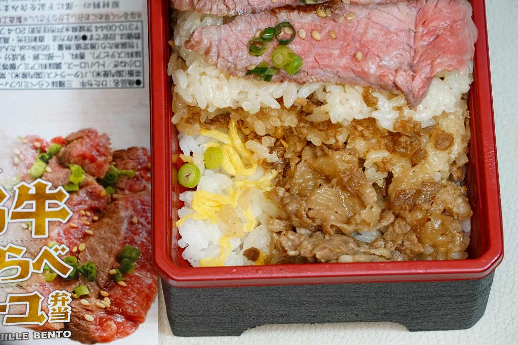 見た目は御飯をステーキで覆ったようなこの商品は、ふたと底を上げた海鮮催事向けプラ容器に、白飯を敷き、牛肉で覆い、茶飯を載せ、牛そぼろで覆い、バターライスを載せ、ステーキで覆い、ネギを振ったもの。現地の駅弁に入る味の濃い牛肉と牛そぼろを少量詰めて香りを付け、御飯を3種も重ねることで、風味を複雑にしたステーキ丼。手間がかかり値段が高いので、現地で売られることはないだろうが、いつかどこかの常温の駅弁でこんな重ね牛丼の風味を楽しみたいと思った。