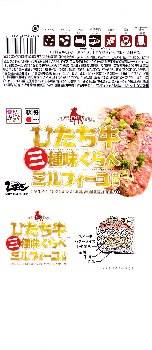 秋冬の駅弁大会シーズンに向けた、2021(令和3)年9月の新商品か。四角い容器に白飯を詰め、牛肉煮で覆い、いんげんと大根桜漬とニンジンで彩り、梅干しとサツマイモを添える。既存の水戸駅弁「牛べん」と、中身はほぼ同じで、容器と値段はまったく同じ。味は「牛べん」でなく、全国各地の催事向け牛肉駅弁に似た、特徴のない感じ。このページにあるとおり、いくつもの牛肉駅弁がある中で、なぜこれを出したのか、不思議に思うところ。京王百貨店の地下食品売り場でしか売られない商品かもしれない。このシーズンで終売か。