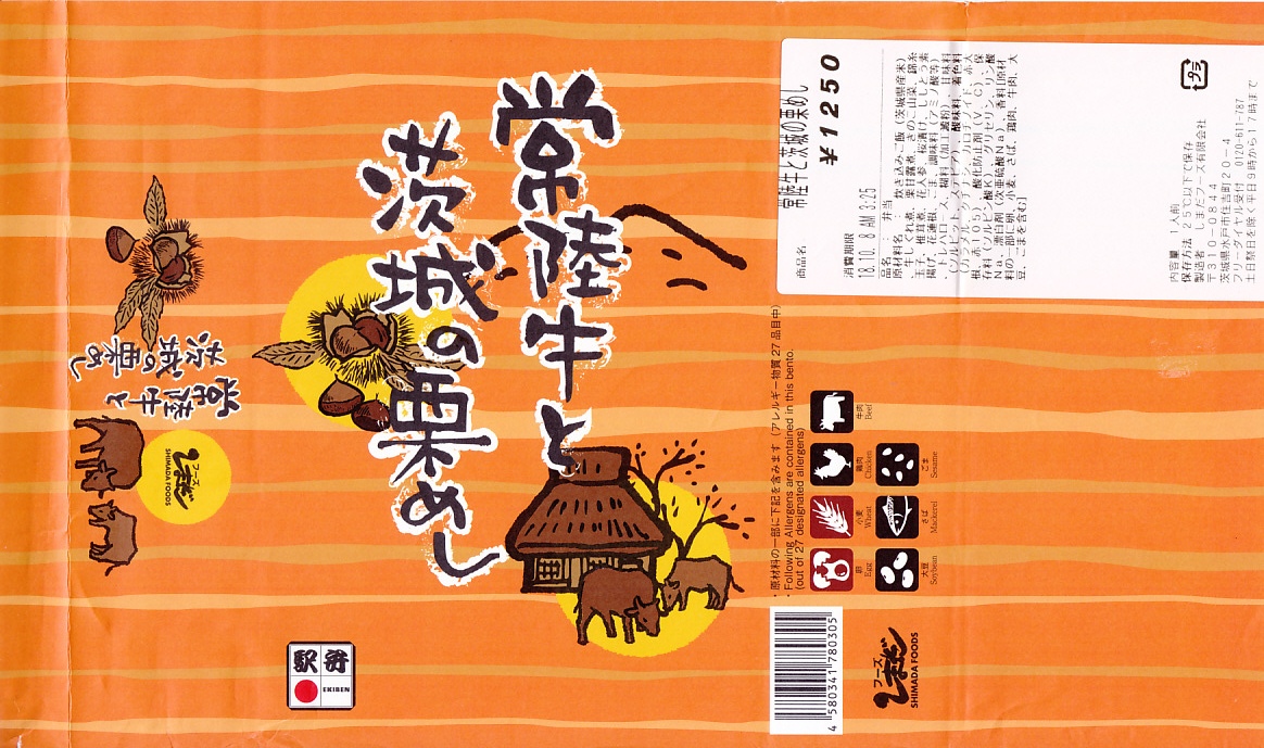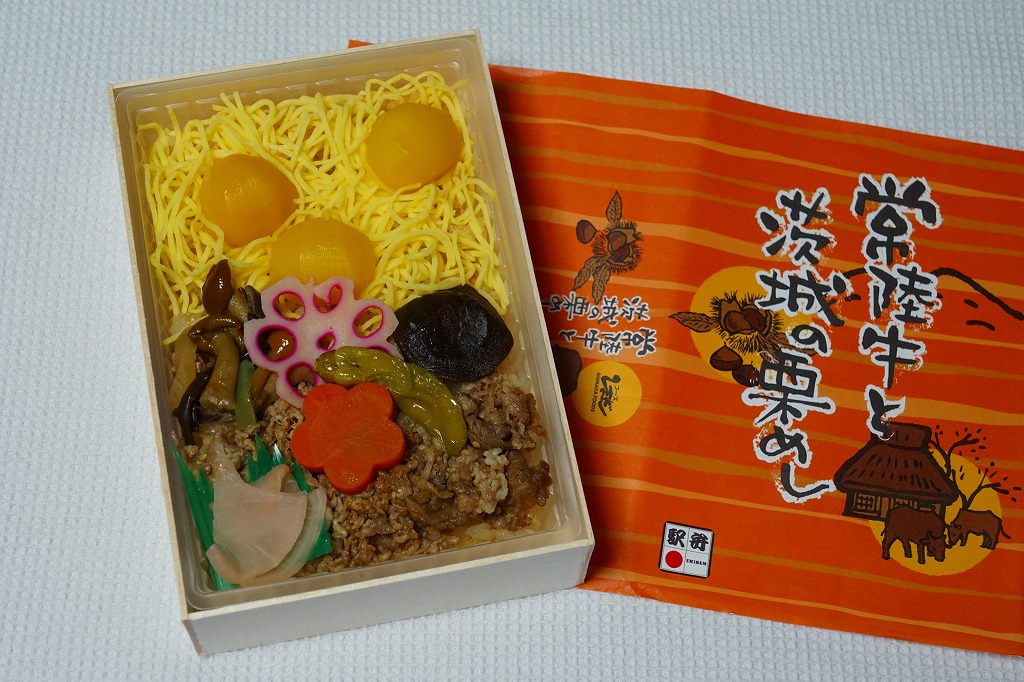2020(令和2)年10月の新作で、同時にJR東日本の駅弁キャンペーン「駅弁味の陣2020」にエントリー。とはいえ、掛紙の絵柄を除き、容器も内容も風味も値段も、2年前の秋駅弁で、やはり駅弁味の陣にエントリーした「常陸牛と茨城の栗めし」と、まったく同じ。長方形の容器に炊込飯を詰め、半分を常陸牛のしぐれ煮で、半分を錦糸卵とクリ甘露煮で覆い、きのこ山菜、シイタケ、ニンジン、れんこん、ししとう、大根桜漬を添えた、牛飯と栗飯の組合せ。価格は2020年の発売時や購入時で1,250円、2023年時点で1,200円に改定。2023年までの販売か。