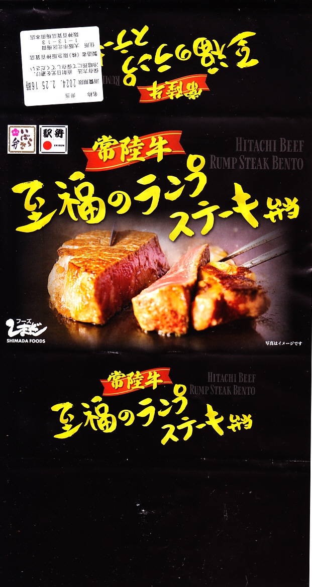 2024(令和6)年1月の京王百貨店の駅弁大会と2月の阪神百貨店の駅弁大会で、これと「至福のランプステーキローストビーフ贅沢盛り弁当」と「常陸牛至福のランプステーキとすき焼き弁当」を実演販売。長方形の容器に白飯を詰め、常陸牛のランプステーキを切り並べて覆い、ナムルやクリなどを付合せ。柔らかく薄造りで食べやすく、タレでなく身と塩で味わえる、高価でおいしい牛ステーキのお弁当だった。水戸駅で売られることは、あるのだろうか。