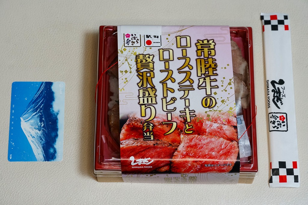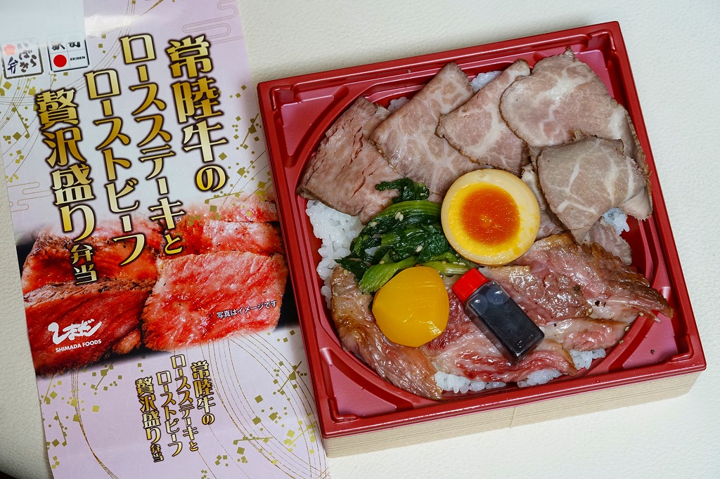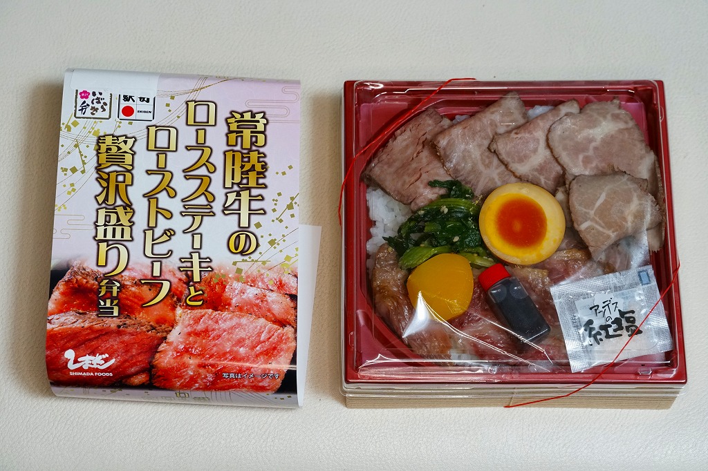 2023(令和5)年1月の京王百貨店の駅弁大会で、これと 「常陸牛のロースステーキ弁当」と「常陸牛のロースステーキとすき焼き弁当」の3種を、水戸駅の駅弁として実演販売。これは正方形の容器に白飯を詰め、常陸牛のロースステーキとローストビーフで半分ずつ覆い、くりと青菜と煮玉子とタレと紅塩を添え、食材の写真が美しい白い掛紙を巻いた。まだ赤くて噛み切れない牛ステーキと、サクサクしたローストビーフが印象的で、こんな駅弁は見たことがない。駅弁を売る水戸駅のコンビニで見ることが、できたかどうか。