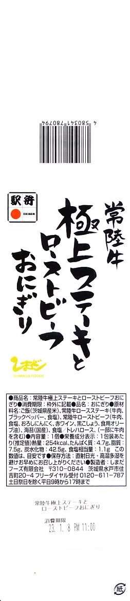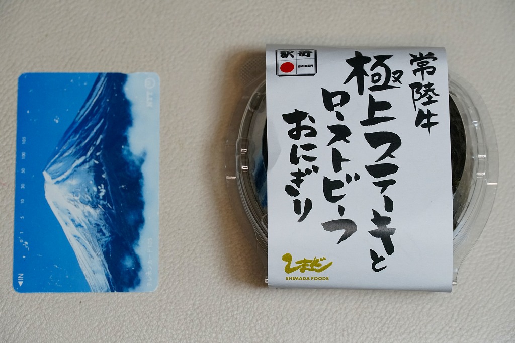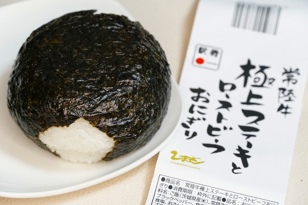 2023(令和5)年1月の京王百貨店の駅弁大会で販売。現物からは読み取れないが、「SDGs×駅弁」として「人気駅弁の端材おにぎりでフードロス削減」と広告し、3種類または5種類のおにぎりを輸送販売した。これは今回の駅弁大会で水戸駅弁として実演販売した3種のローストビーフ弁当のものと思われ、白飯に常陸牛のロースステーキとローストビーフを詰めて海苔でぴったり巻いた、固く締まる丸いおにぎりを1個、プラ製ケースに収めて掛紙を巻いたもの。いつかどこかで売られるように、なるかどうか。