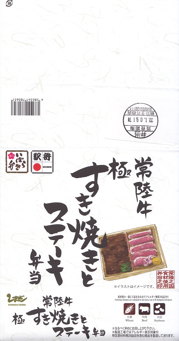 秋冬の駅弁大会シーズンに向けた、2021(令和3)年秋の新商品か。長方形の容器に白飯を詰め、平たい常陸牛のすき焼き肉で覆い尽くし、ごぼう漬、煮物、糸こんにゃく、揚げれんこん、金時豆などを添える。水戸駅には下記のとおり、お肉の駅弁は数あれど、そういえばすき焼き弁当がなかった。値は張るものの、催事でもおそらく現地でも冷蔵で売られるものの、見た目どおり、スリーブの見本写真どおりの風味は楽しめると思う。このシーズンのみの販売か。