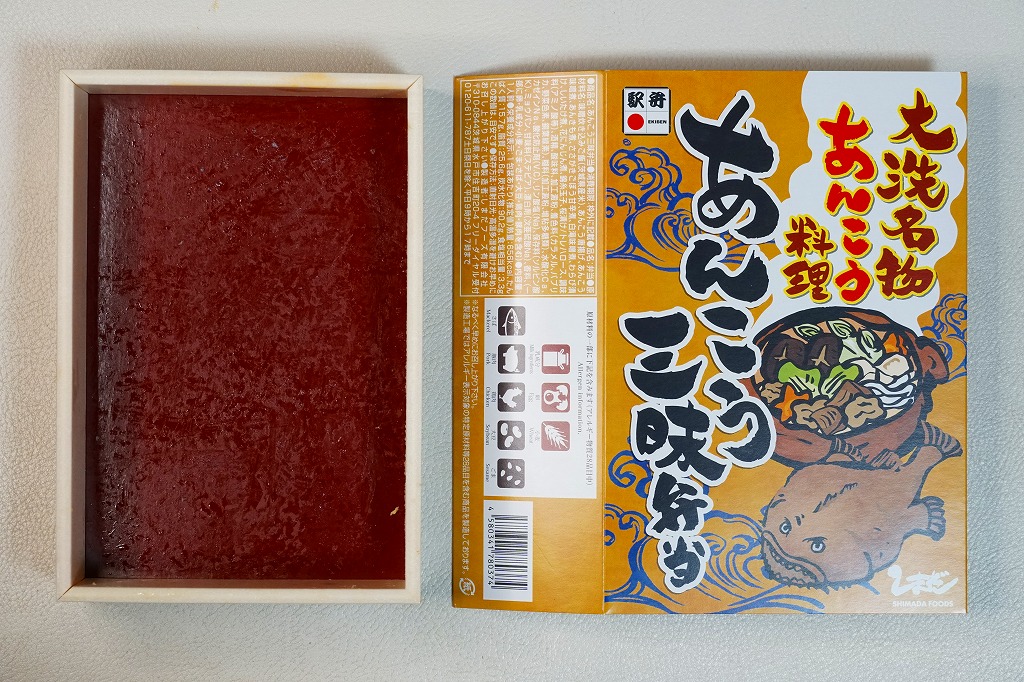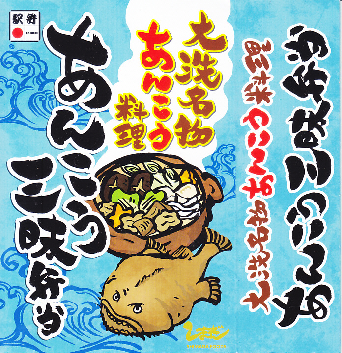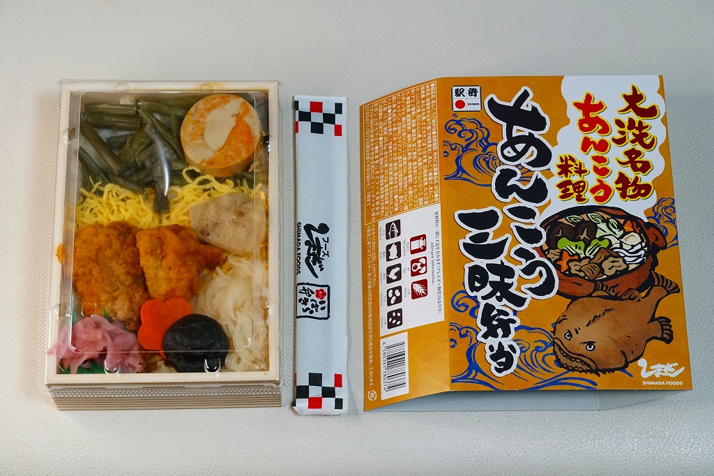 JR東日本の駅弁キャンペーン「駅弁味の陣2019」へのエントリーに向け、2019(令和元)年10月1日に水戸駅や勝田駅と東京駅で発売。ここでは茨城県東茨城郡大洗町の名物とする、茨城県北部や福島県の太平洋岸で親しまれるアンコウを主題にした、とても珍しい駅弁。四角い容器に味噌炊込飯を詰め、アンコウの唐揚げ、アンコウの味噌煮、あんきも(アンコウの肝)煮を載せ、ささがきごぼう、しらたき、ミツバ、しいたけ、にんじん、錦糸卵、大根桜漬を添える。食堂でなく弁当で、あんきもが食べられるとは驚いた。うまく知名度が広まれば、例えば駅弁味の陣で駅弁大将軍に選ばれれば、水戸駅の冬の名物駅弁になるのではないかと思う。価格は2019年の発売時や購入時で1,100円、2023年時点で1,200円、2024年9月20日から1,280円。