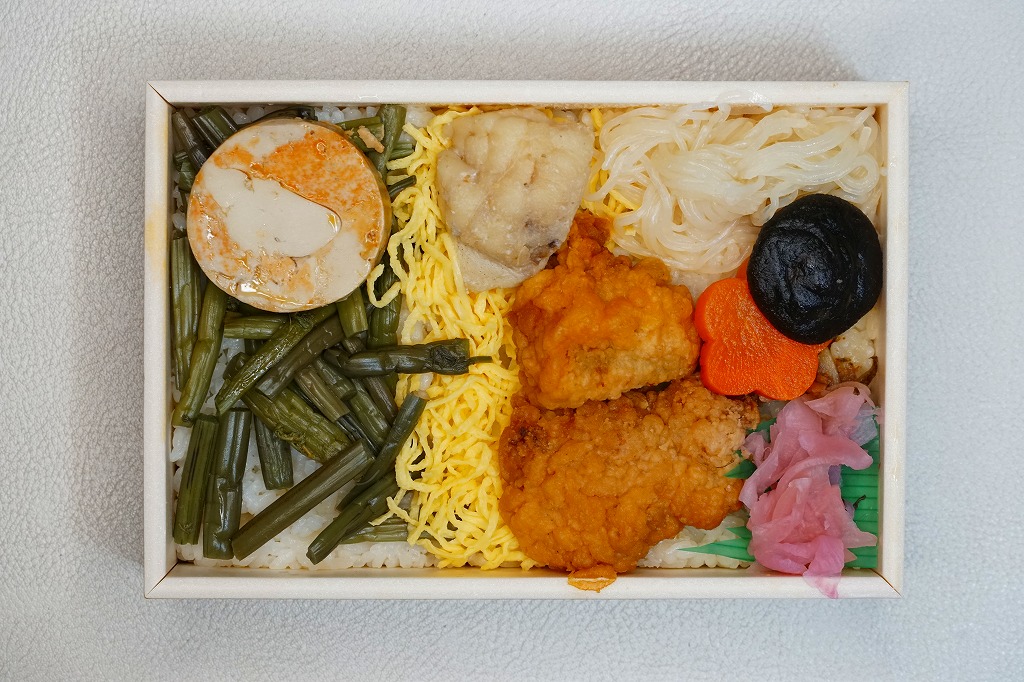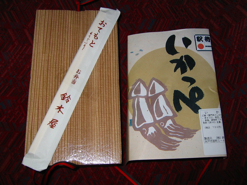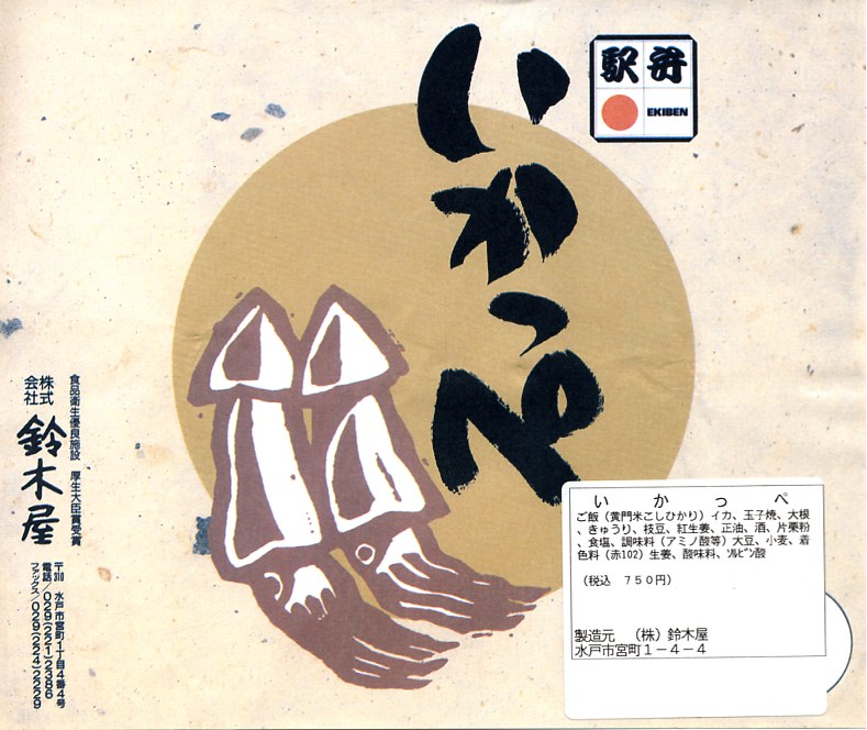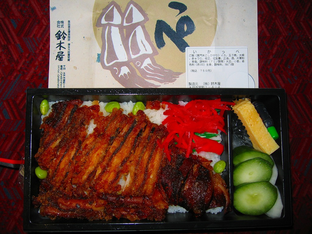 2007(平成19)年の新作か。木目調の長方形の容器に、商品名とイカを簡易に描いたカラーコピーの掛紙をかけて、ひもで十字にしばる。中身は黄門米コシヒカリの白御飯の上にイカフライが一ハイ分載り、紅生姜や枝豆、玉子焼と浅漬けが添えられるもの。