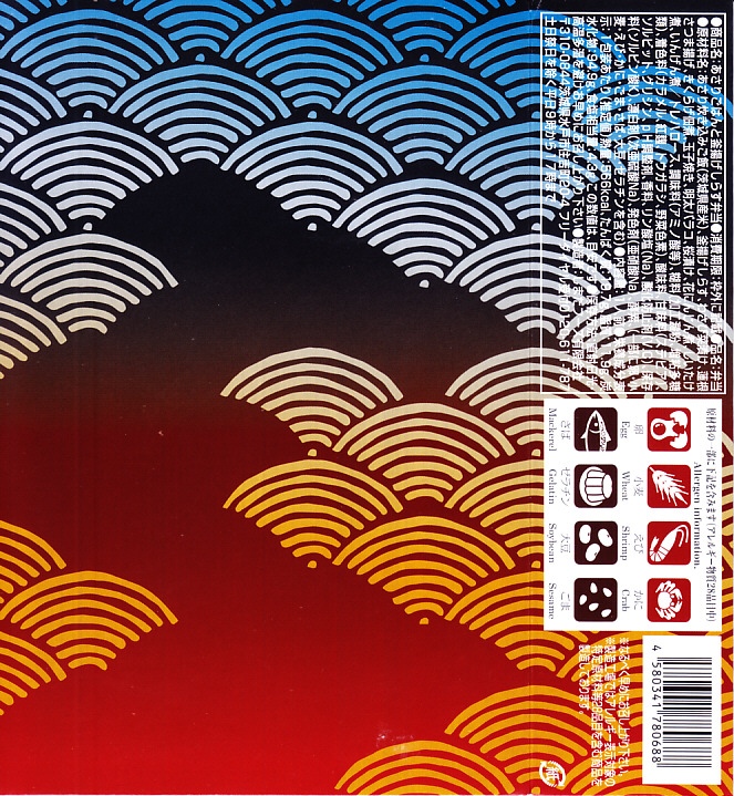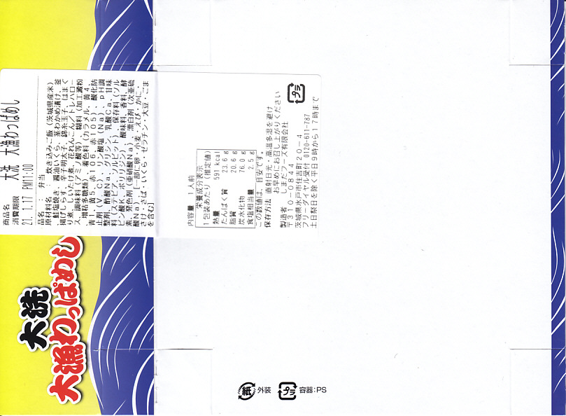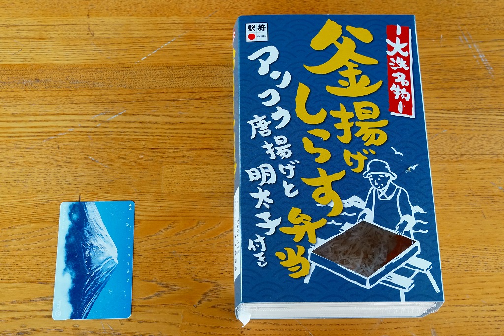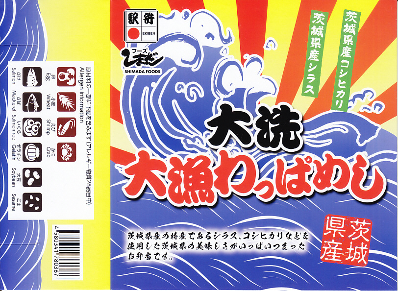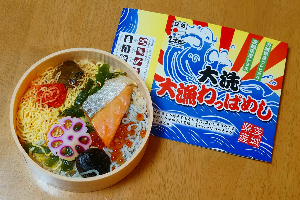 秋冬の駅弁大会シーズンに向けた、2019(令和元)年秋の新商品か。大洗と書いてあるが、大洗駅ではなく水戸駅の駅弁である。スリーブはまるで漁船の大漁旗のような、おめでたい絵柄。中身は茶飯を焼鮭、ハマグリ、明太子、イクラ、シラス、錦糸卵などを散らして覆うもの。見たと違い、具が少なめ、飯のおかずになるようなものが少なめなので、錦糸卵で御飯を食べ進めたような感じ。2シーズン販売し、2021年春に終売か。