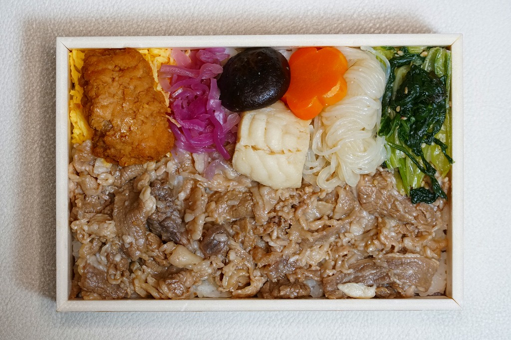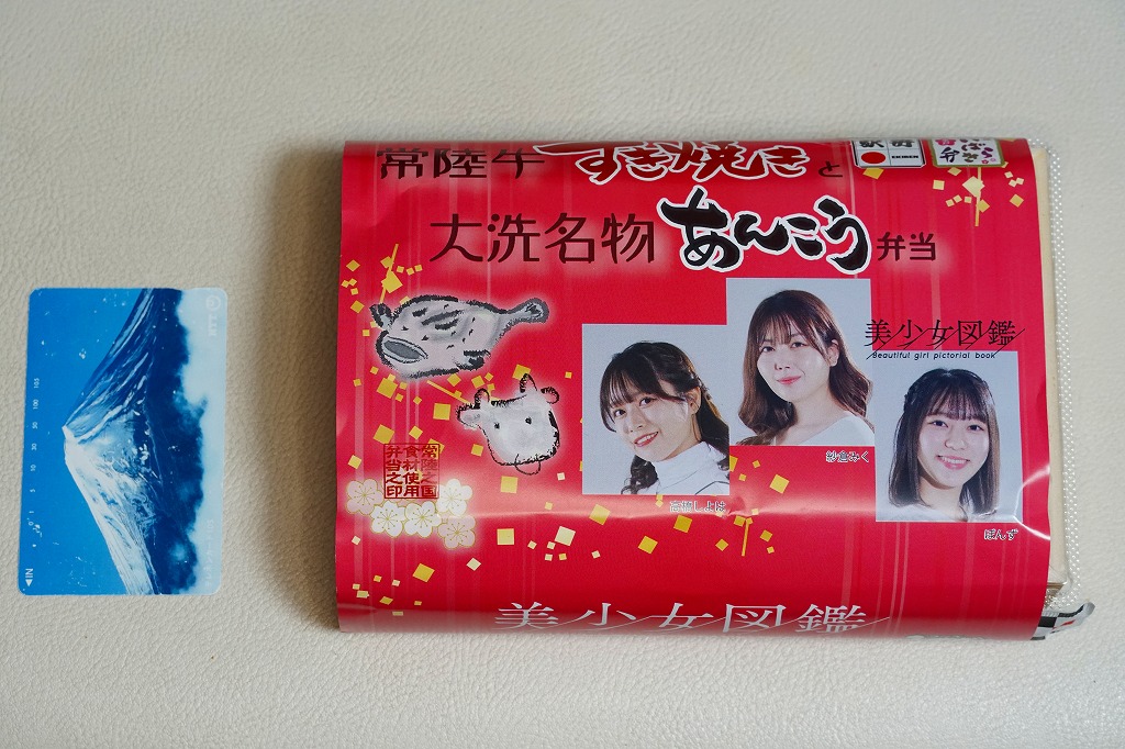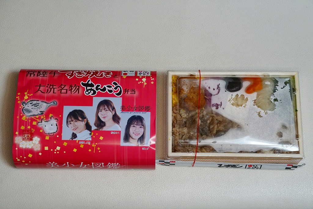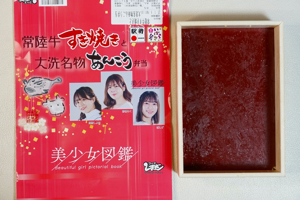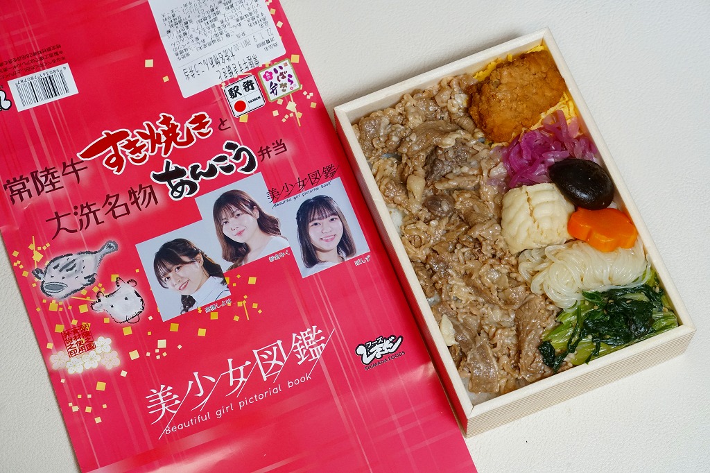 ピンク色の掛紙には、商品名と食材のイラストと、女性3名の顔写真を載せる。中身は白飯の半分を常陸牛の牛肉煮で、半分を小松菜、しらたき、あんこう味噌煮、紫キャベツ、錦糸卵、あんこう唐揚げなどで覆うもの。既存の水戸駅弁を組み合わせた内容で、不思議な構成かもしれないが、違和感はない。
