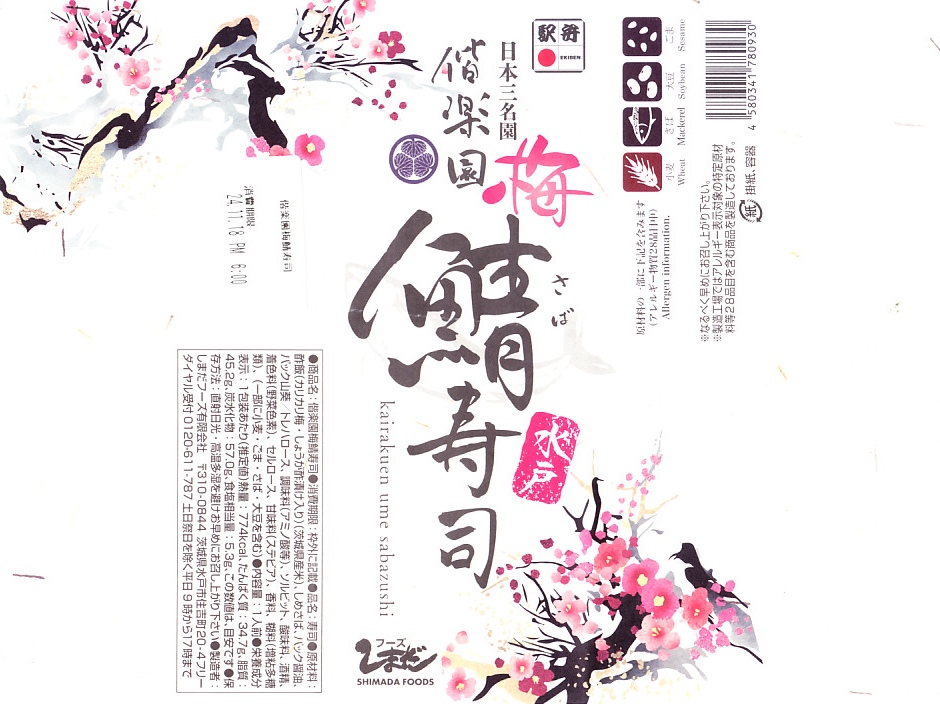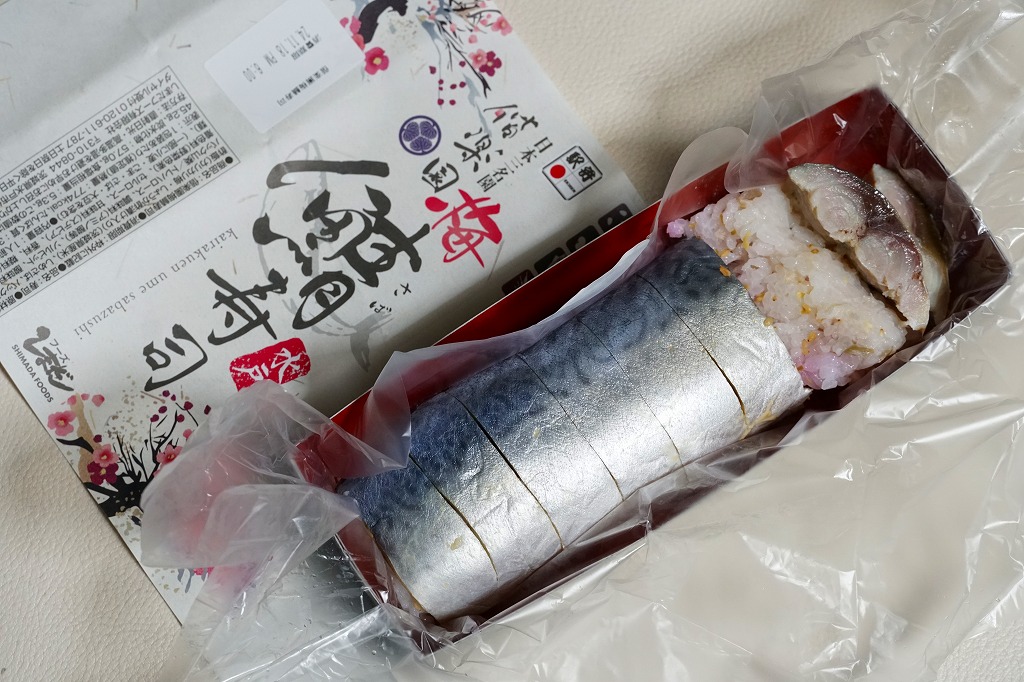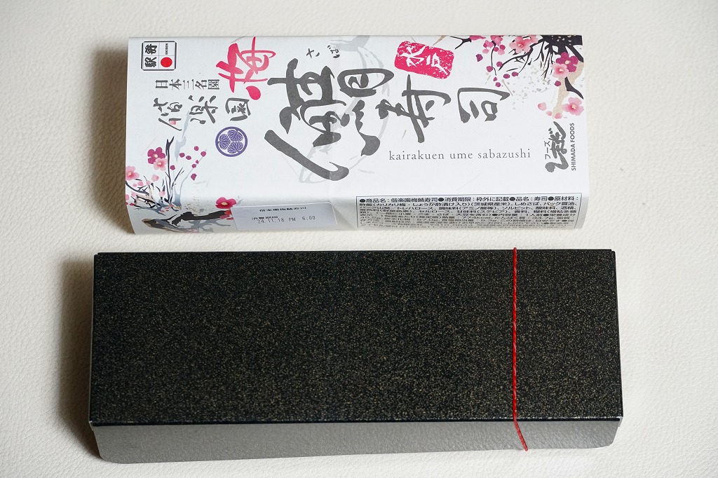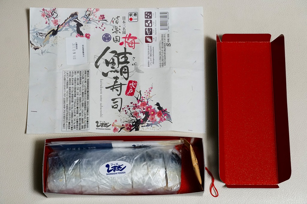 2023(令和5)年12月までに水戸駅や特急「ひたち」車内で発売か。焼かないサバの棒寿司が1本、フィルムを巻かれて紙箱に収まり、梅花と魚と商品名でデザインした掛紙を巻く。細かく刻んだ梅干しと甘酢生姜と白ごまを混ぜた酢飯は、その様々な酸味により、今では脂が乗ったり身厚にすると生臭いと言われがちなシメサバの味を中和し、爽やかさを加えていると思う。水戸の偕楽園が梅の名所であることも、水戸駅の駅弁とその商品名で使うに合う。