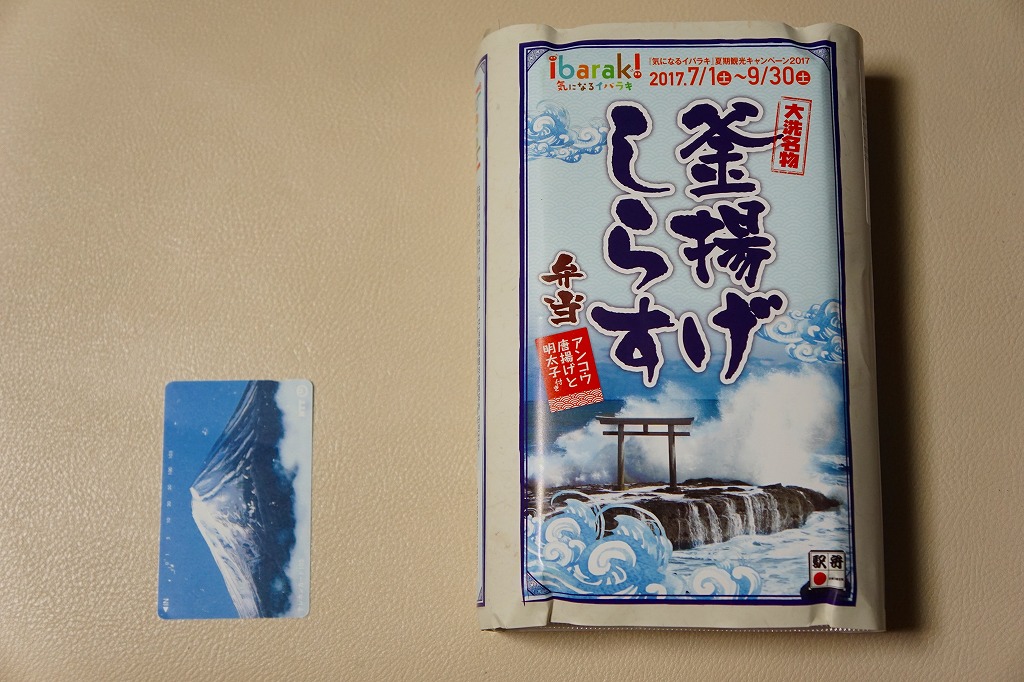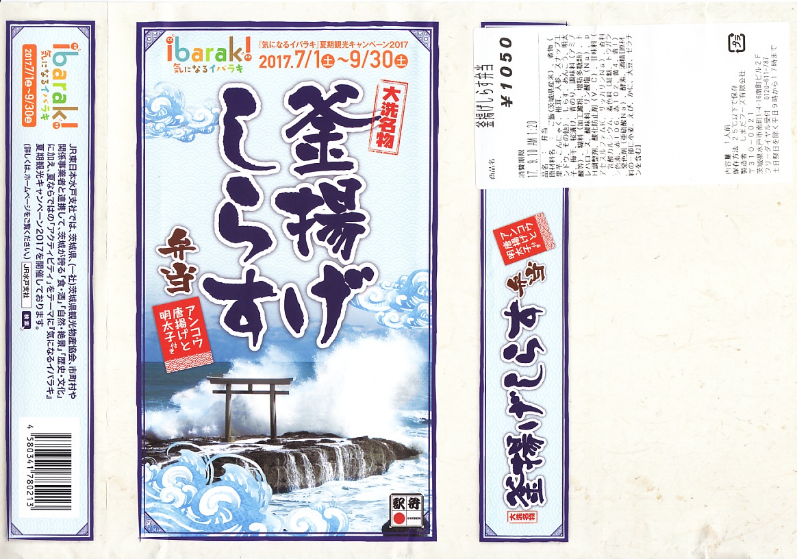 2017(平成29)年9月9日に購入した、水戸駅弁の掛紙。発売当時はボール紙枠でなく掛紙を使用し、掛紙で大洗の太平洋と磯前神社の鳥居を描いていた。