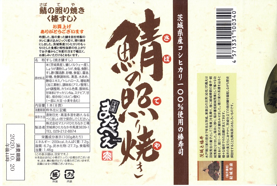2014(平成26)年までには発売されていた模様。少なくとも2016(平成28)年には勝田駅で売られるようになったらしい。上記の水戸駅弁あるいは茨城空弁「常陸國またべえ焼き鯖すし」の、焼きサバをサバの照り焼きに差し替えて、掛紙も別のものを用意した。いずれもサバを焼いたものなので、中身も味も同じもののように思える。