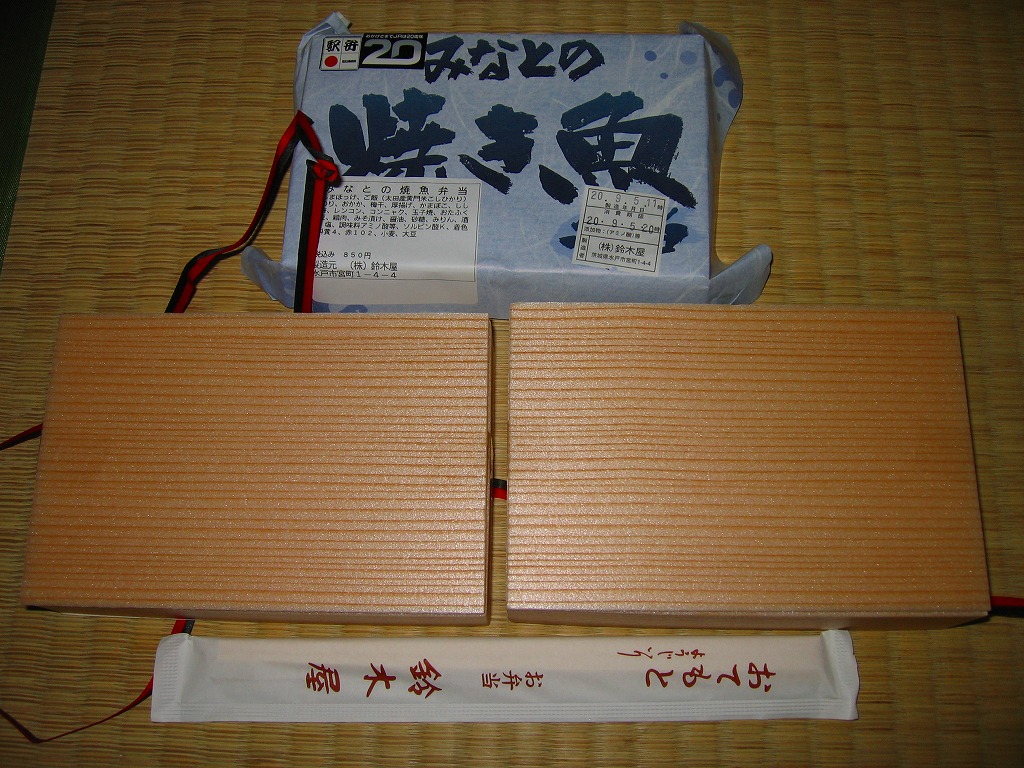 JR東日本発足20周年記念駅弁の水戸駅鈴木屋版として、2007(平成19)年の夏に発売。小柄な長方形の木目柄容器を2段に重ね、商品名を書いた青い掛紙をかけて、ひもで十字にしばる。中身は下段が黄門米コシヒカリを使用した海苔弁タイプのおかかごはん、上段がしまほっけの焼き魚に玉子焼、鶏照焼、カマボコ、レンコンとこんにゃくの煮物、煮豆にタクアンなど。焼き魚をメインとした駅弁は珍しく、しまほっけの風味と分量が素晴らしい。