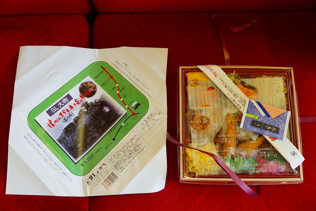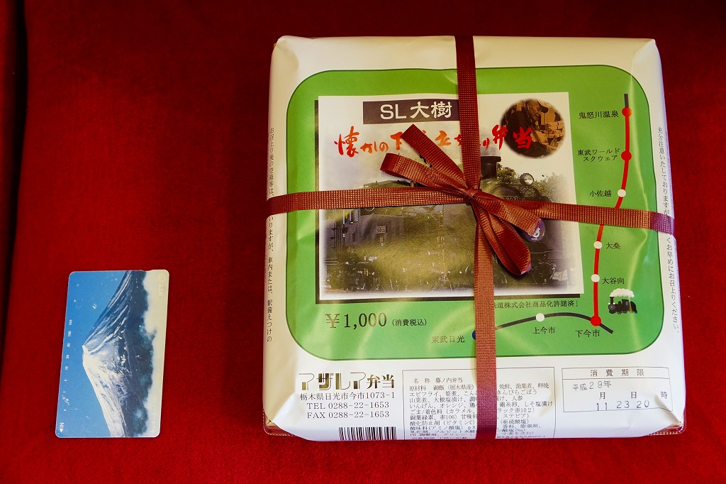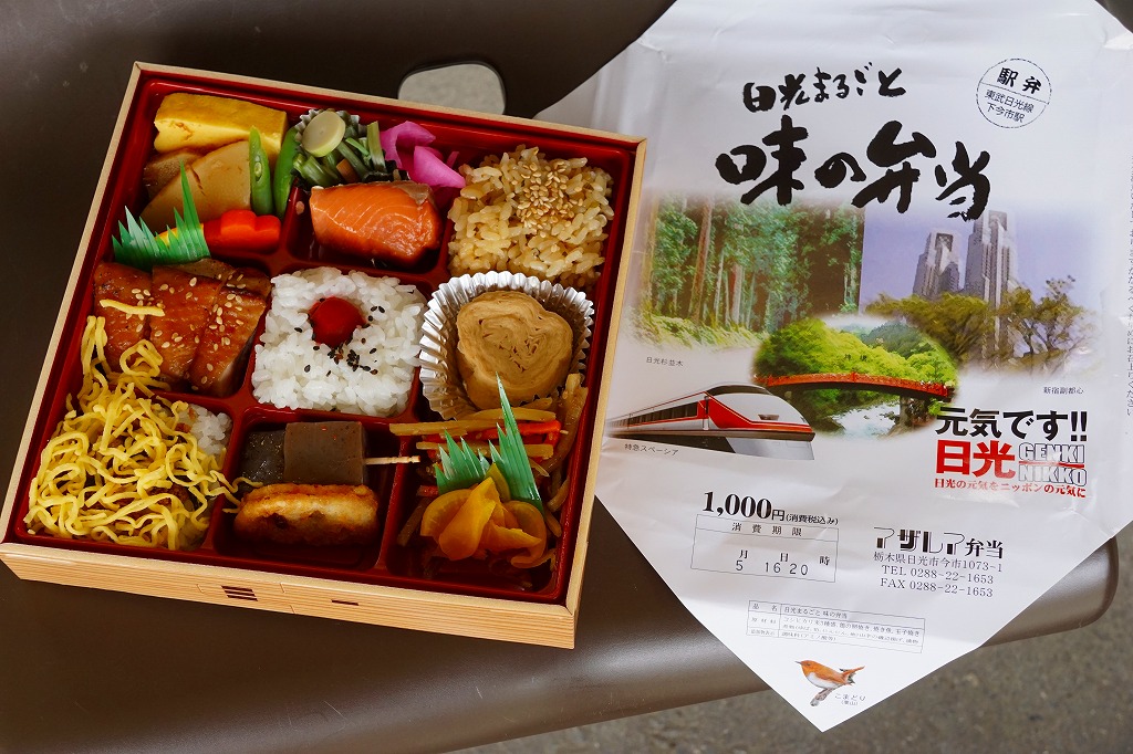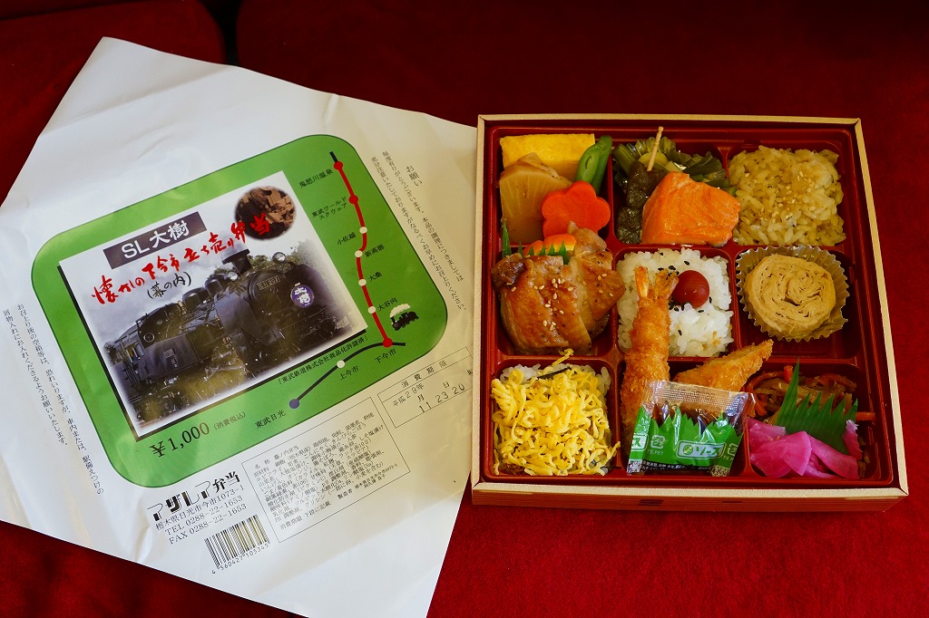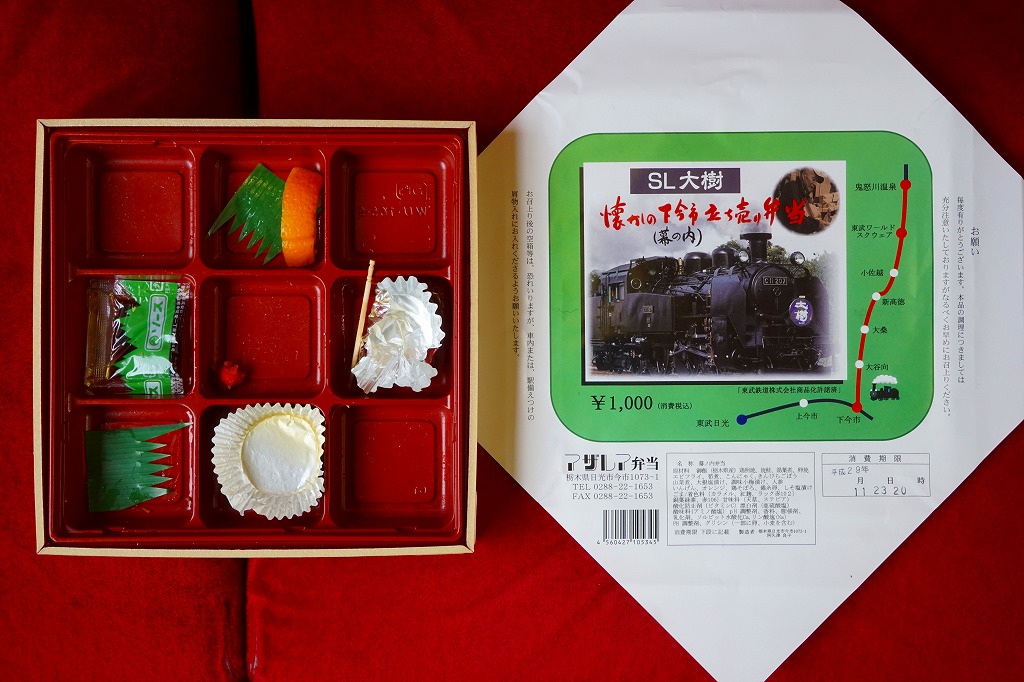 東武鉄道のSL列車「SL大樹」の運行開始に合わせて、2017(平成29)年8月に発売。とはいえ、容器と価格は下記の駅弁「日光まるごと味の弁当」と同じで、中身もほとんど同じ。9区画に日の丸御飯、茶飯、そぼろ御飯で3種の御飯と、湯波(ゆば)、鶏照焼とオレンジ、タケノコとニンジンとインゲンの煮物と玉子焼、焼鮭と山菜とこんにゃく、きんぴらごぼうと大根桜漬、エビフライ。掛紙はSL大樹の写真と路線図、駅弁の名前にはかつての駅弁立売の名を入れた。東武日光駅と下今市駅の売店で売られた。2019年までの販売か。