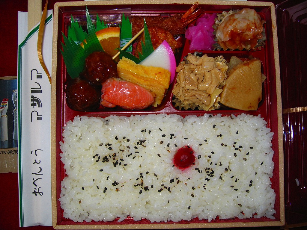 東武日光線下今市駅のホーム上で立ち売りされた幕の内弁当。発泡材枠トレー接着の正方形の容器に透明なふたと白い掛紙をかけてビニールひもでしばる。中身はコシヒカリの日の丸御飯にエビフライ・焼き魚・玉子焼・タケノコ・焼売・肉団子・蒲鉾と湯葉など。