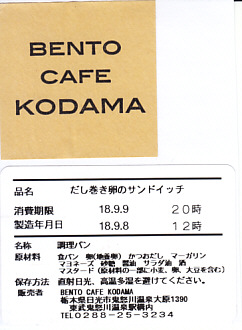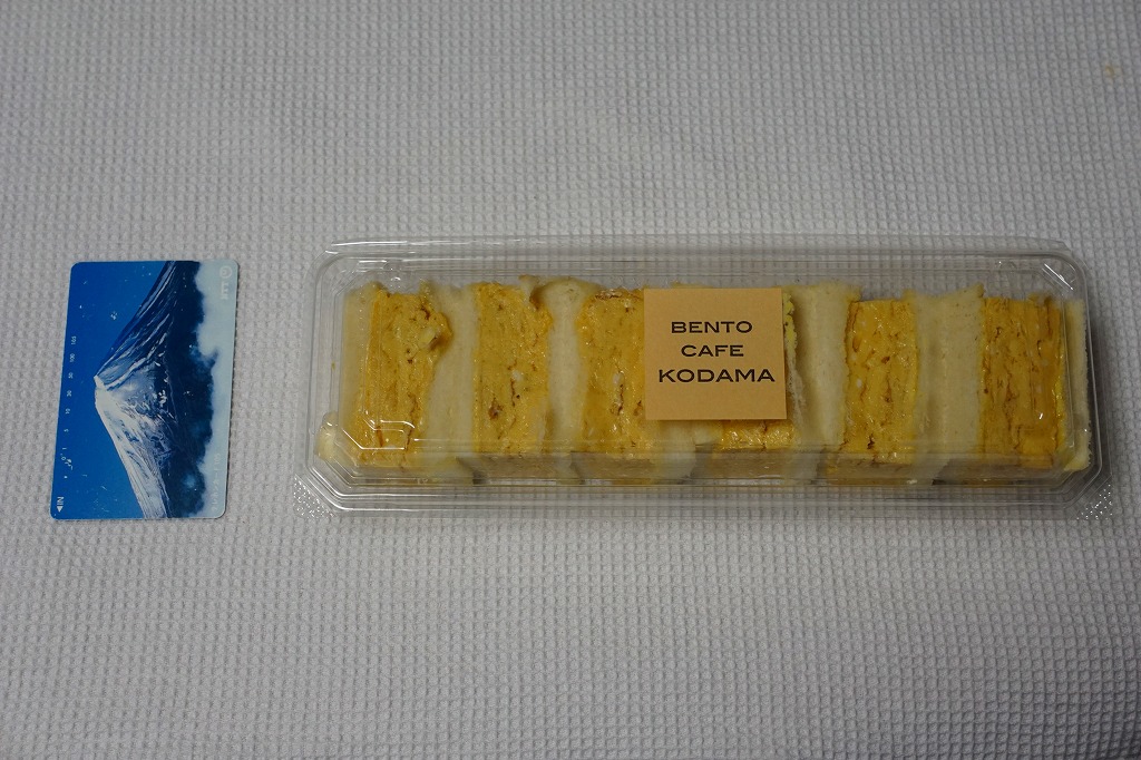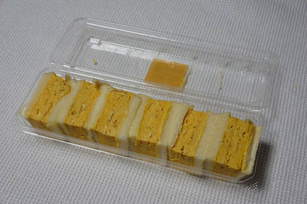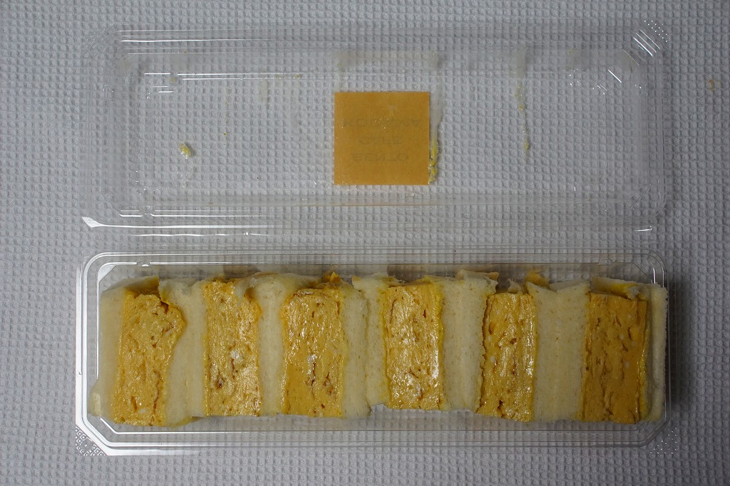 2018(平成30)年5月頃の発売か。鬼怒川温泉駅で下記の駅弁を売る店舗で買えたサンドイッチで、カフェのイートインメニュー。小さな正方形の玉子焼サンドを6切れ詰めて、カフェの名を記したシールを貼っていた。最近流行の厚くて甘い玉子焼サンドであり、手作り感があった。価格は2018年の購入時で510円、2020年時点で594円、2023年時点で648円。2023年までの販売か。